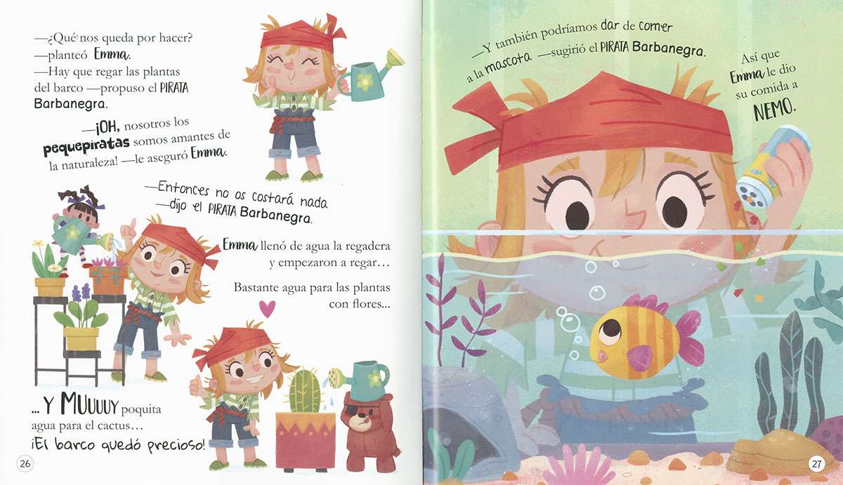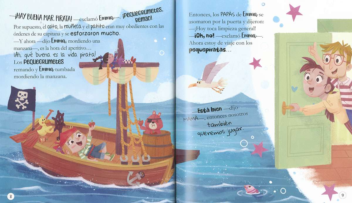 Un sábado lluvioso no era el mejor día para salir a jugar al parque, ni para montar en bici o patinar, pero sí para convertirse de nuevo... ¡en la pirata Emma! Así que la capitana reunió a su tripulación de pequepiratas y se dispuso a cargar el barco para una larga travesía. Pero entonces, aparecieron los padres de Emma, que también querían jugar a ser piratas. Se pusieron un nombre y... ¡a la aventura! Primero, había que preparar el camarote, luego fregar la cubierta, pescar la comida... ¡y mucho más! ¡Qué gran día pasaron todos juntos en casa jugando y trabajando! Una mañana de martes, Emma se despertó con muchas ganas de hacerse pirata, pero antes sus padres y sus abuelos le enseñaron todo lo que tiene que tener un pirata para ser el mejor: un buen desayuno, un uniforme perfecto, la bandera y la espada, ¡y mucho mucho más! Un gran libro ilustrado a todo color para los piratas más aventureros.