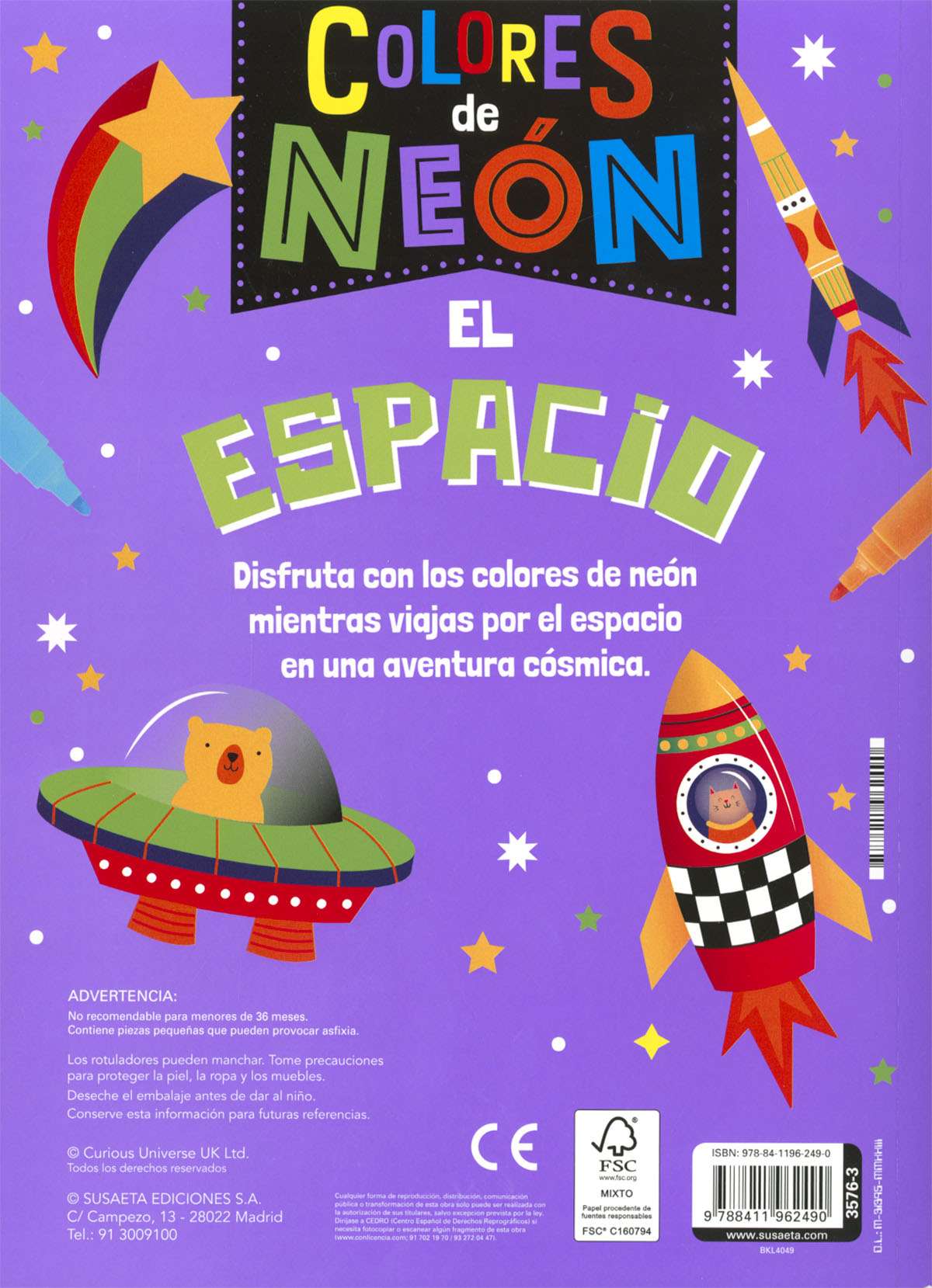 Disfruta coloreando con los rotuladores de neón las láminas de este libro mientras viajas por el espacio en una aventura cósmica.