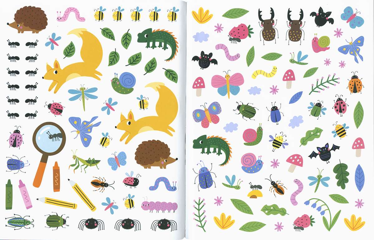 Conoce a un montón de bichitos con este libro de actividades. ¡Une los puntos, busca diferencias, dibuja, colorea, recorre laberintos y diviértete con las pegatinas!