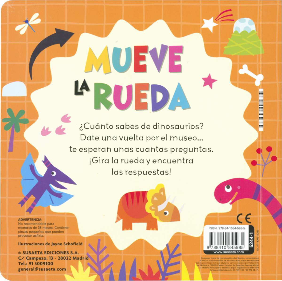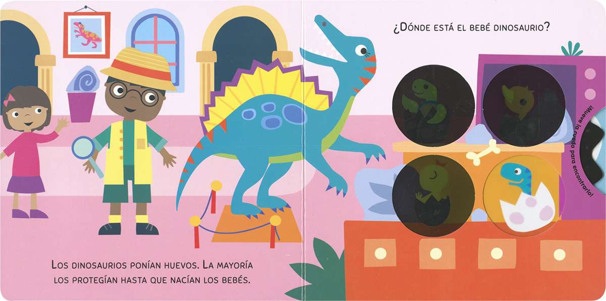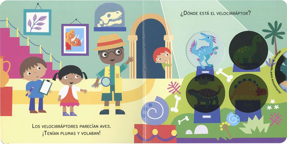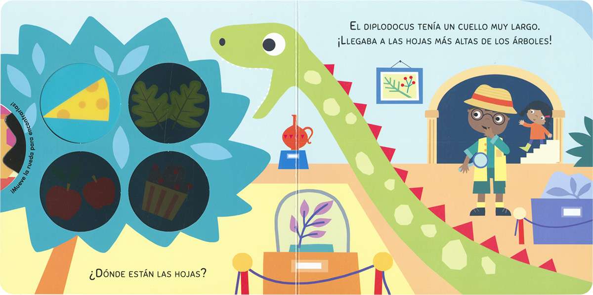 ¿Cuánto sabes de dinosaurios? Date una vuelta por el museo... Te esperan unas cuantas preguntas. ¡Gira la rueda y encuentra las respuestas! Un libro de cartón interactivo para aprender leyendo y jugando.