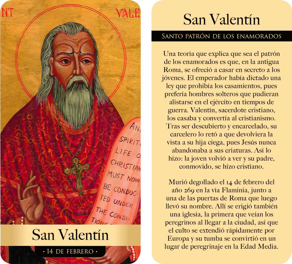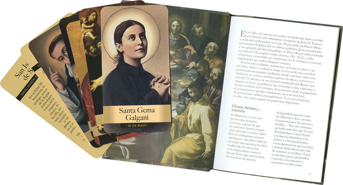 Caja que contiene 40 estampas de santos del cristianismo, representados en hermosas obras pictóricas, además de un libro de 80 páginas que muestra su vida y ejemplo, qué santo se festeja cada uno de los 365 días del años y un capítulo especial dedicado al culto a la Virgen María.