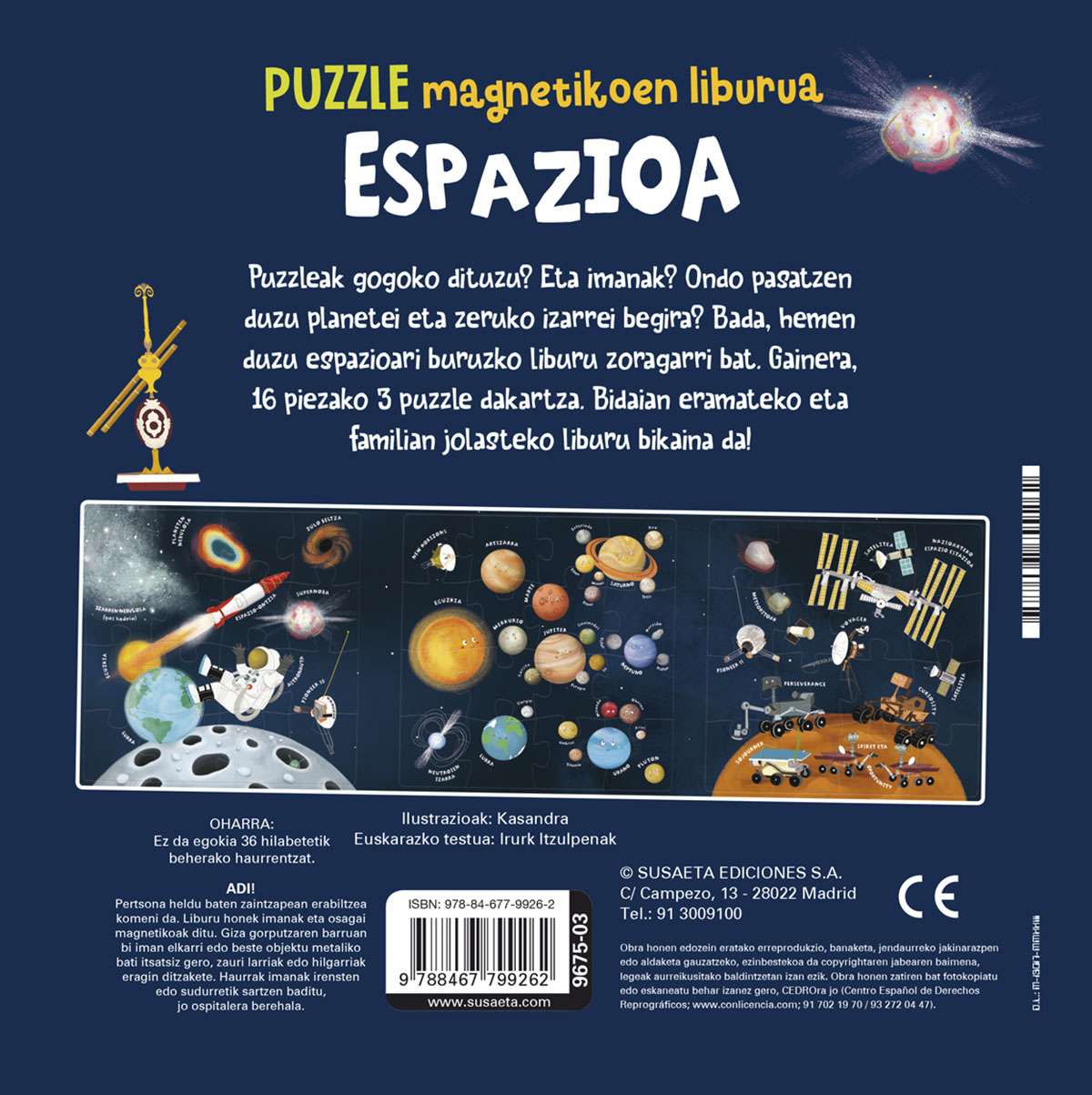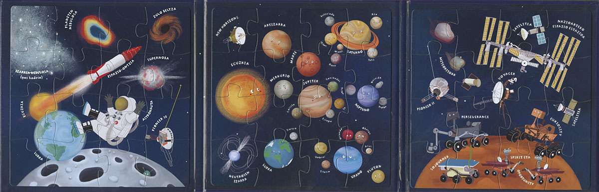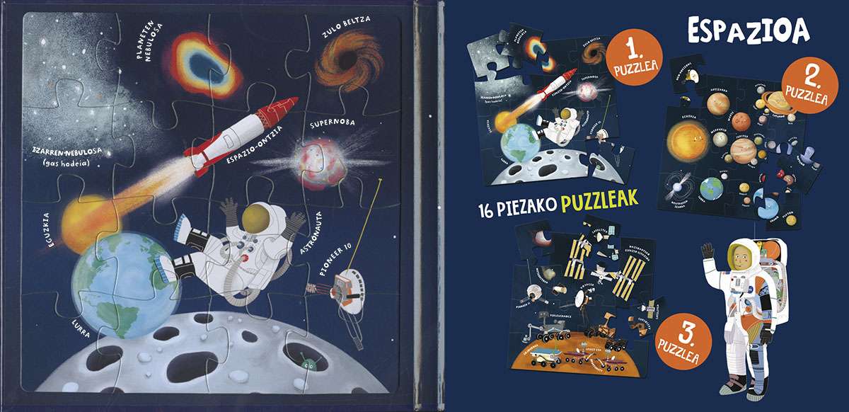 Puzzleak gogoko dituzu? Eta imanak? Ondo pasatzen duzu planetei eta zeruko izarrei begira? Bada, hemen duzu espazioari buruzko liburu zoragarri bat. Gainera, 16 piezako 3 puzzle dakartza. Bidaian eramateko eta familian jolasteko liburu bikaina da!