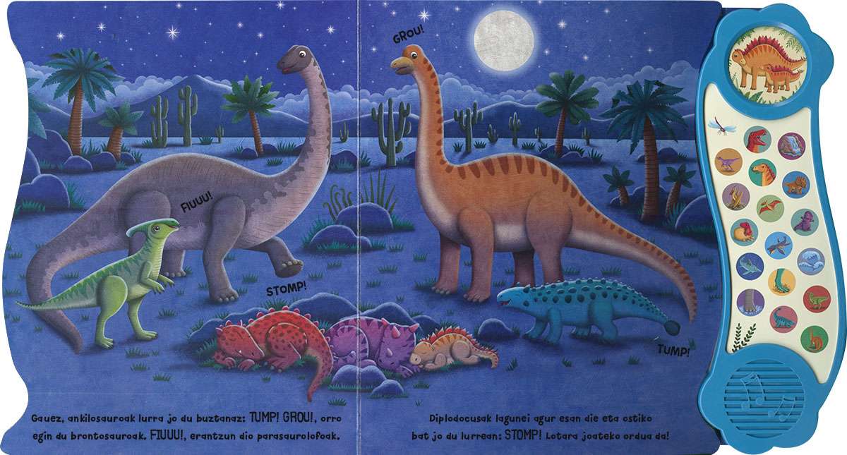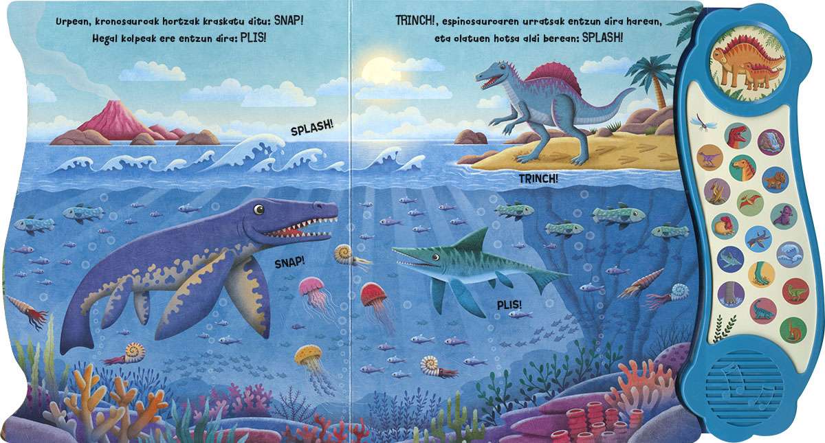 Ezagutu dinosauroen mundu txundigarr ia! Igo mendi tontorr era edo murgildu itsasoan eta entzun 18 dinosauroren hotsak. Tiranosauroaren orr oa, pterodaktiloaren karr anka... Esploratzaile txikientzako liburu aproposa da.
