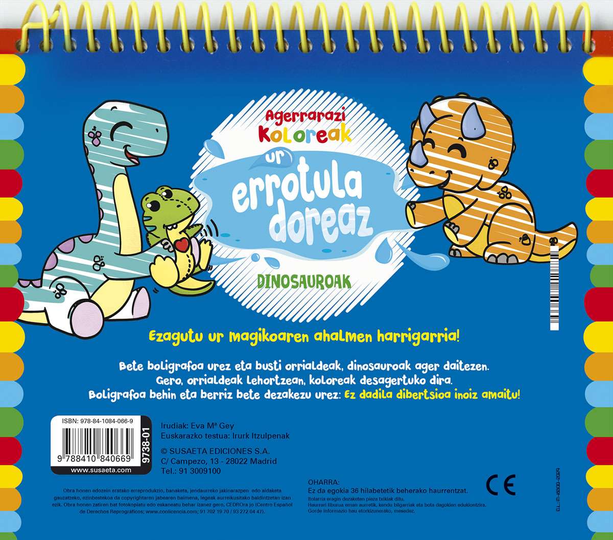 Ezagutu ur magikoaren ahalmen harrigarria! Bete boligrafoa urez eta busti orrialdeak, dinosauroak ager daitezen. Gero, orrialdeak lehortzean, koloreak desagertuko dira. Boligrafoa behin eta berriz bete dezakezu urez: Ez dadila dibertsioa inoiz amaitu!
