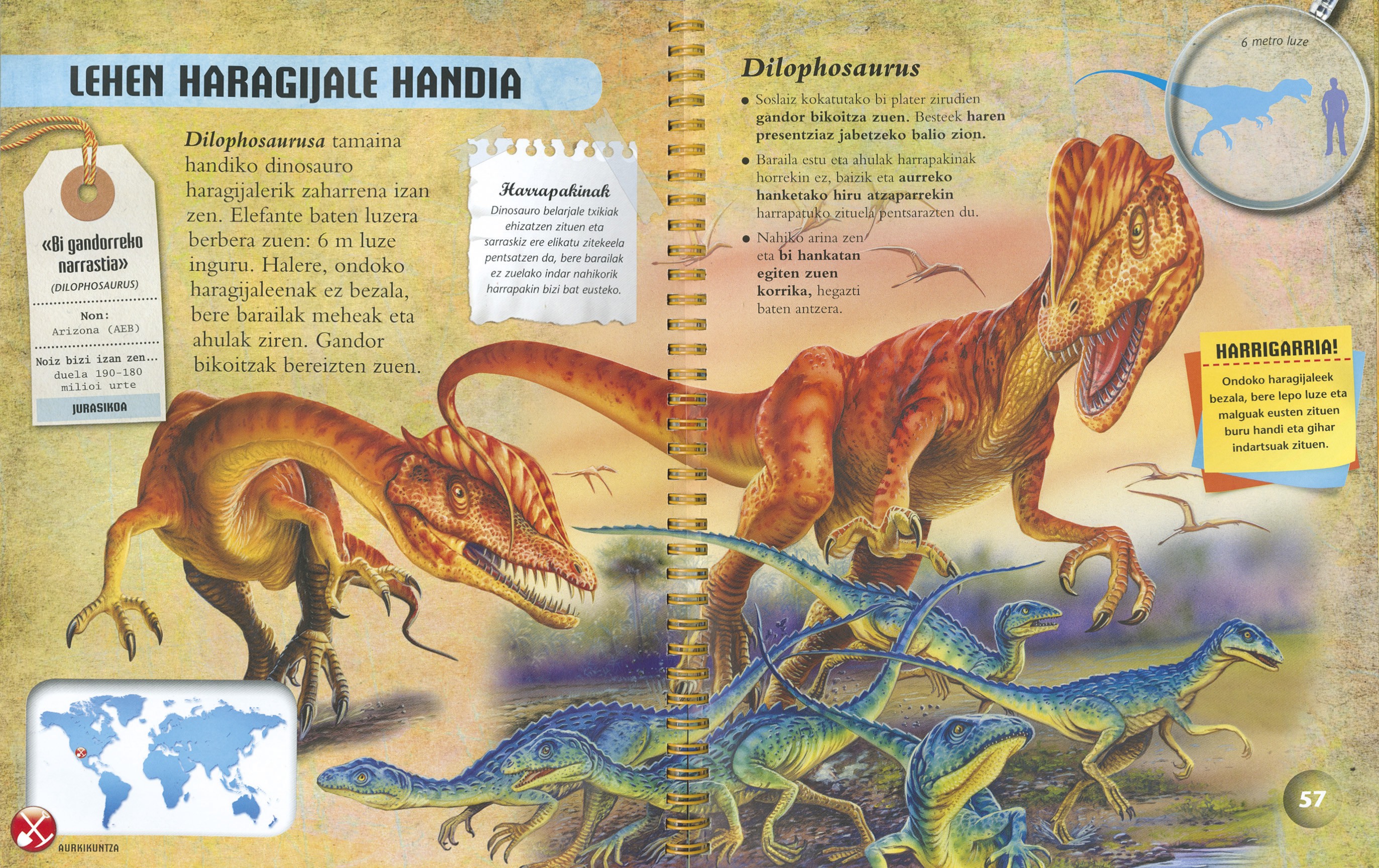 Dinosauroak duela milioika urte bizi izan ziren, periodo Triasikoan, Jurasikoan eta Kretazeoan, oraindik gizakirik ez zen garaian. Ibili eta korrika egiteko gaitasuna zuten lehorreko narrastiak ziren. Liburu honen eskutik dinosauroen mundu zoragarria ezagutuko duzu. Ehunka ilustrazio eta daturen bidez, horien ohitura, elikadura, tamaina, talde-bizimodua eta beste hainbat kontu erakutsiko dizkizu.
