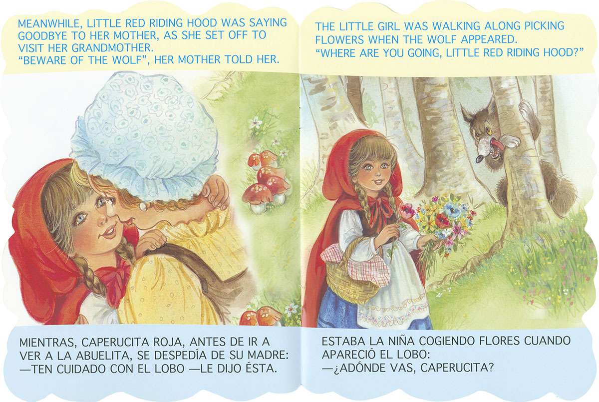 El cuento de Caperucita Roja, con unas preciosas ilustraciones a todo color y letra mayúscula, en edición bilingüe para aquellos niños que quieren hablar el inglés y el español igual de bien.
