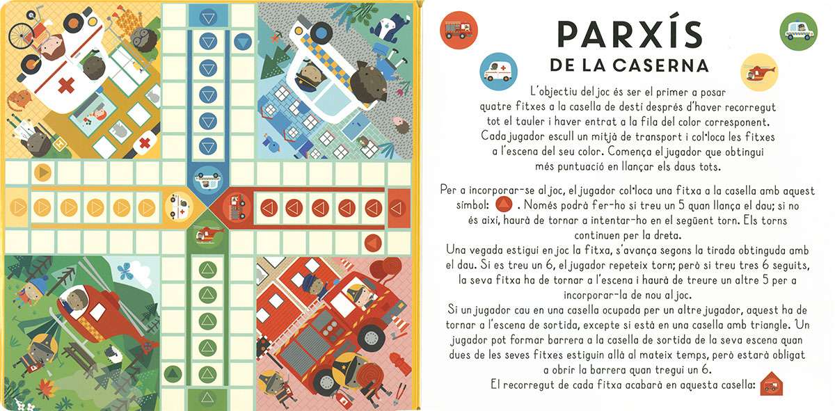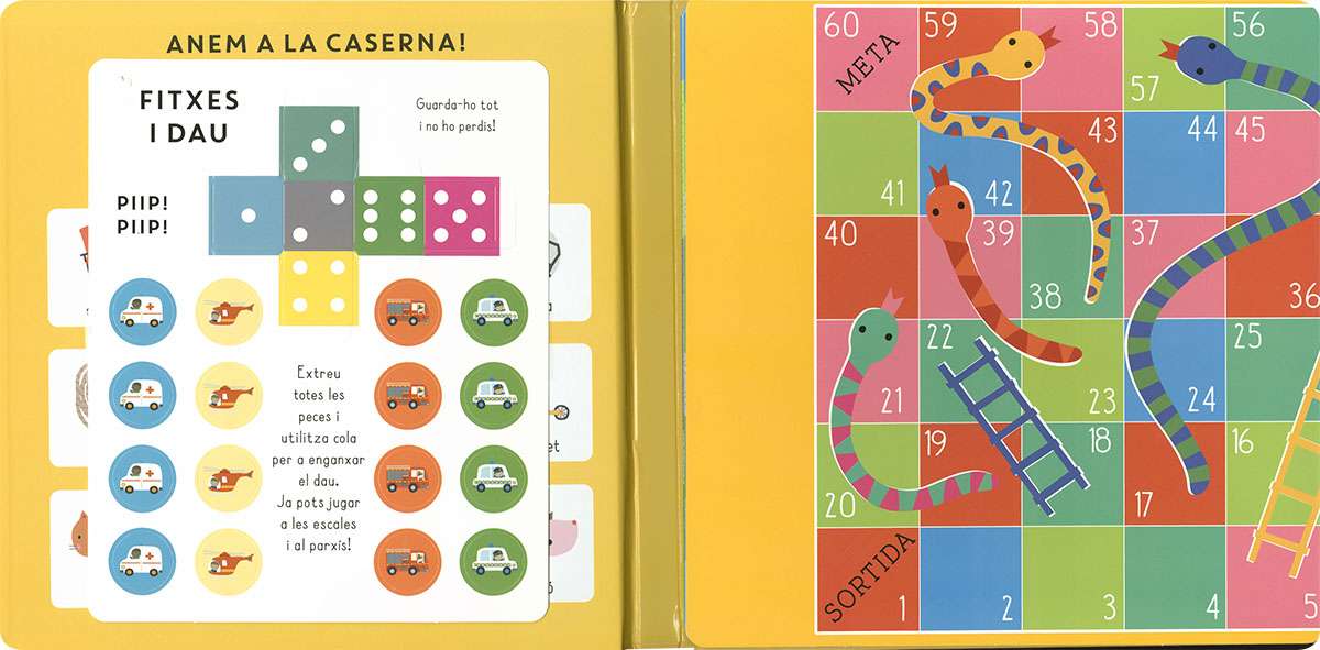 Obre aquest llibre i viu una aventura! Escull un lloc per a desplegar-lo a terra i enfil't al camió de bombers: apagarás incendis, rescatarás gats... i farás un munt de coses més! Inclou 2 jocs de taula amb fitxes i dau per a muntar.