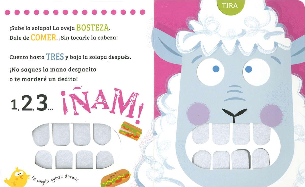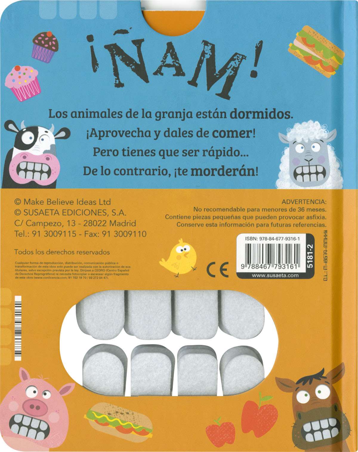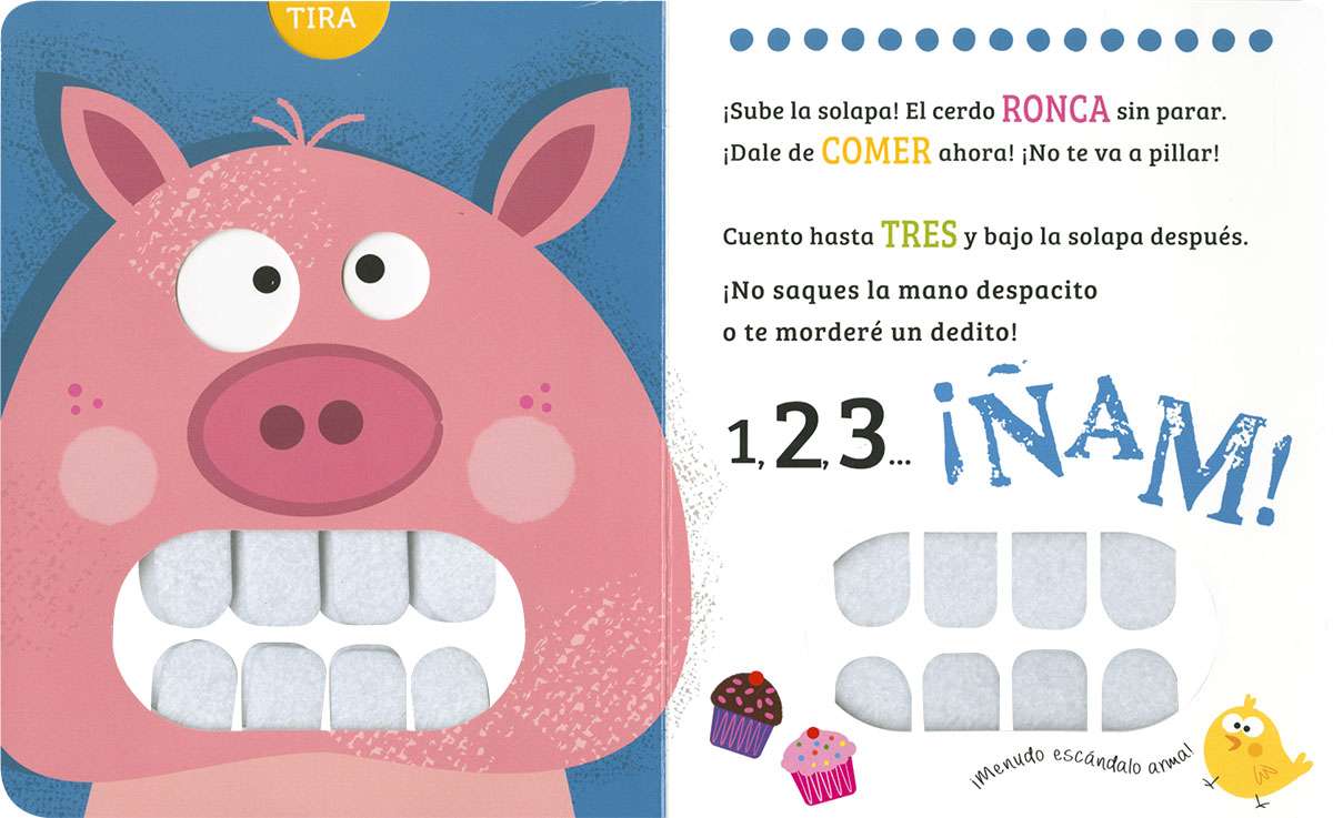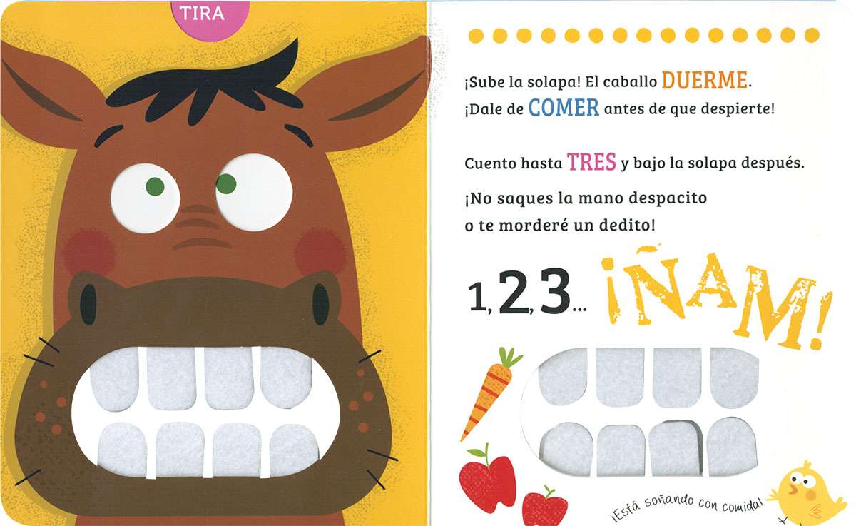 Los animales de la granja están dormidos. ¡Aprovecha y dales de comer! Pero tienes que ser rápido... de lo contrario, ¡te morderán! Juega con este divertido libro de cartón y evita que los animales te pillen los dedos con sus enormes dientes de fieltro al cerrar la solapa de su boca.