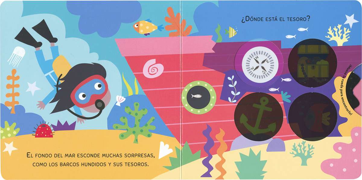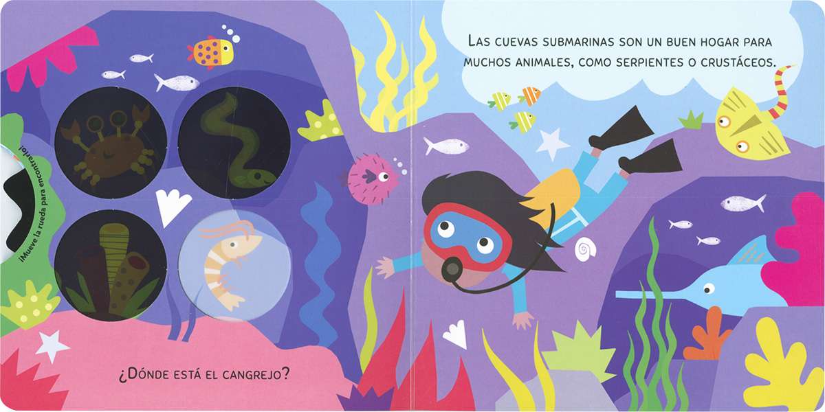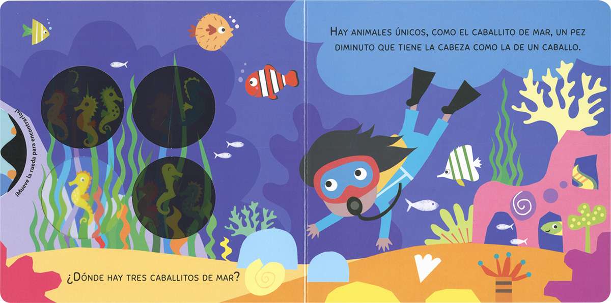 ¿Cuánto sabes de la vida marina? Date una vuelta bajo el mar... Te esperan unas cuantas preguntas. ¡Gira la rueda y encuentra las respuestas! Un libro de cartón interactivo para aprender leyendo y jugando.