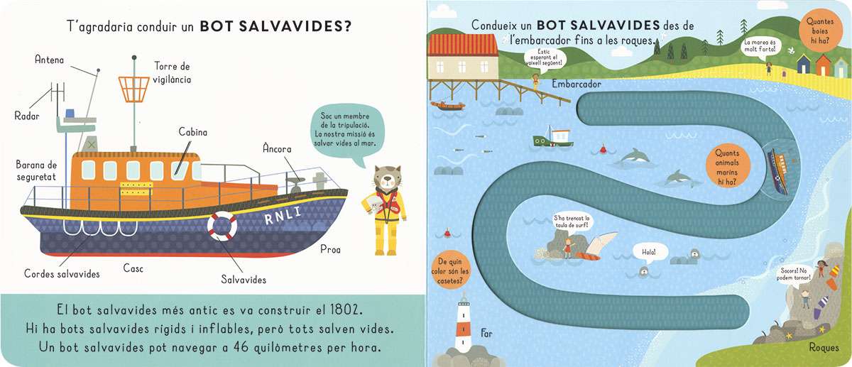 T'agradaria conduir un camió de bombers? I un bot salvavides? Amb aquest llibre de cartró podràs fer-ho: mou el disc pel camí traçat amb el teu ditet mentre aprens un munt de coses de cada vehicle. N'hi ha cinc de diferents per conduir!