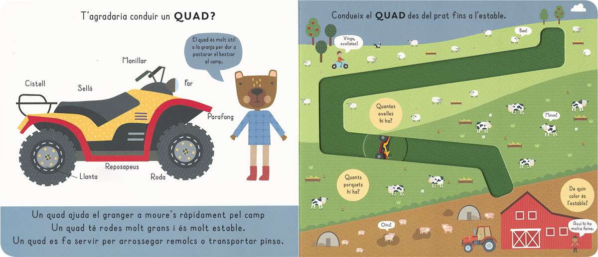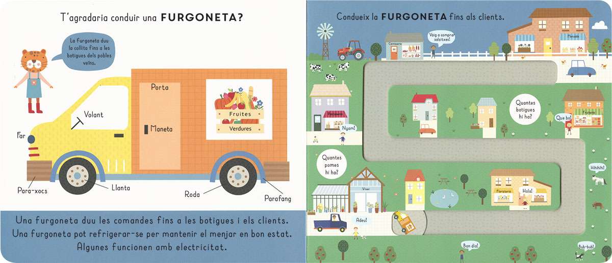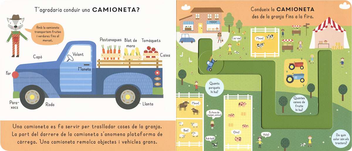 T'agradaria conduir un tractor? I una recol·lectora? Amb aquest llibre de cartró podràs fer-ho: mou el disc pel camí traçat amb el teu ditet mentre aprens un munt de coses de cada vehicle. N'hi ha cinc de diferents per conduir!