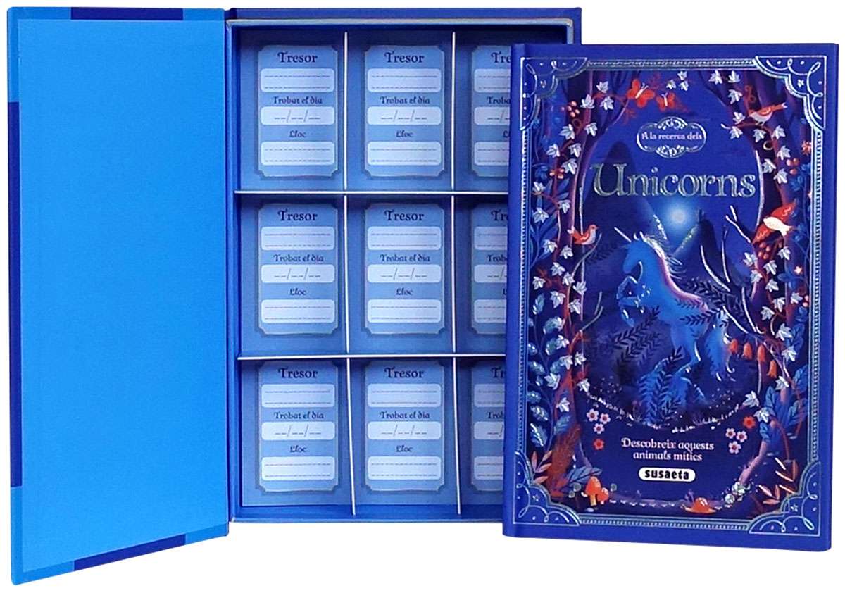 Enquadernació: Caixa de cartró plastificada mat amb estampació, interior llibre i separadors per tresors