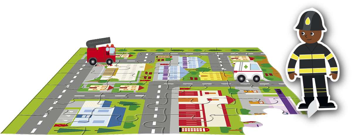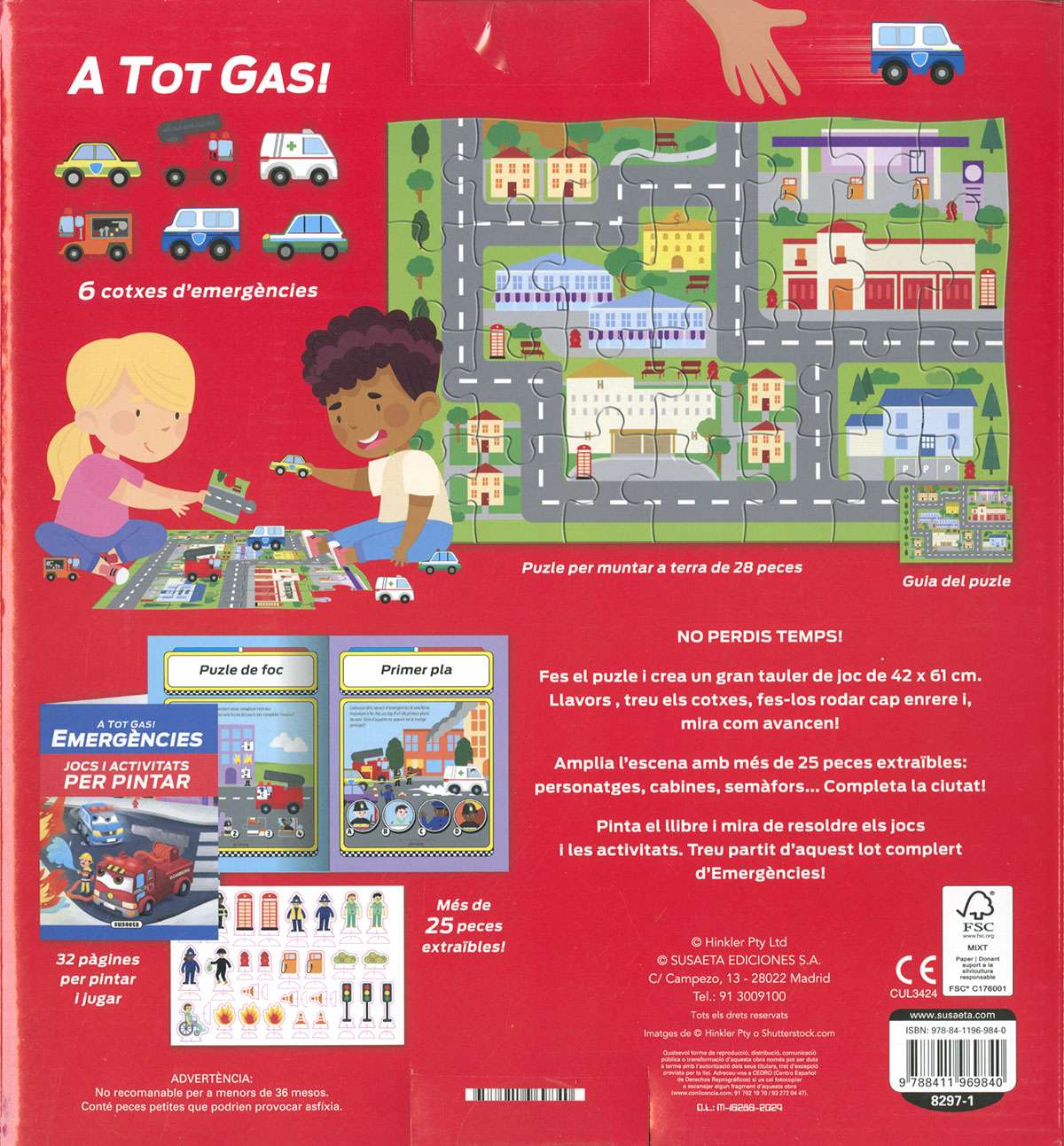 Un complet kit infantil que inclou un llibre d'activitats per pintar, un trencaclosques gegant de 28 peces, figuretes extraïbles i 6 vehicles d'emergència amb corda enrere amb què divertir-se... a tot gas!