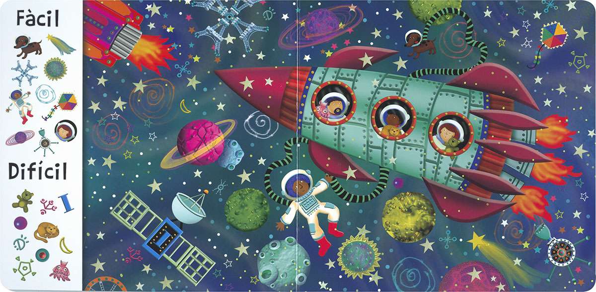 Obre les pàgines daquest SORPRENENT LLIBRE i busca a lESPAI un munt de PERSONATGES i dOBJECTES. Alguns són més FÀCILS de trobar i daltres una mica més DIFÍCILS. Vols intentar-ho?