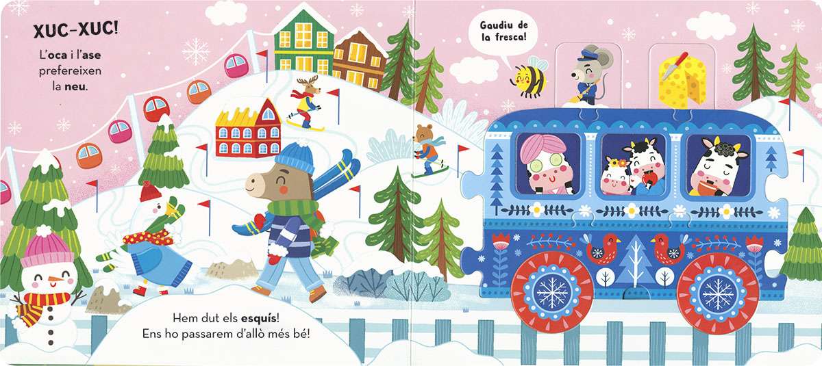 Puja a bord del tren de la granja! Els animals agafen el tren per anar de vacances. Quins llocs visitaran? Esbrina-ho amb aquest preciós llibre puzle. Extreu les peces, munta la locomotora i els vagons i uneix-los per formar un tren fantàstic.