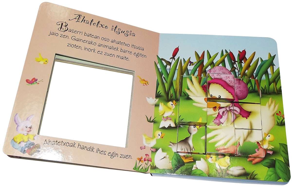 Enquadernació: Caixa amb llibre de fulles de cartró plastificat i encunyat amb purpurina i puzle de galledes