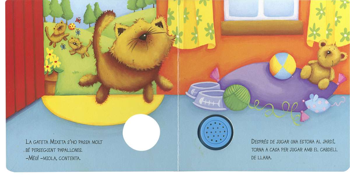 La Mixeta es passa el dia jugant! Li encanta passajar-se pel jardí i perseguir papallones, encara que el que més li agrada és jugar amb el seu cabdell... Coneix la Mixeta i diverteix-te amb ella amb la col·leccó Sons d'animals.
