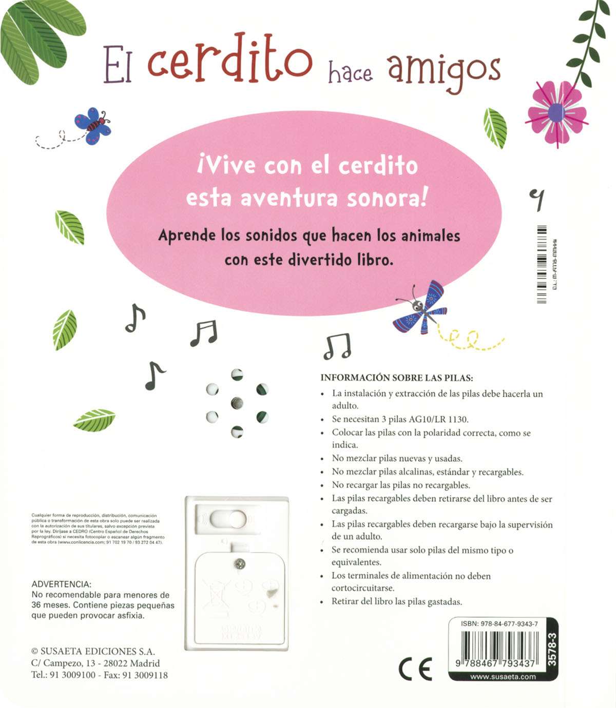 Escucha los sonidos de los animales de este libro pulsando los botones de silicona. Tienes cinco sonidos en este libro de cartón, que podrás descubrir a medida que lees la historia de este cerdito tan simpático.
