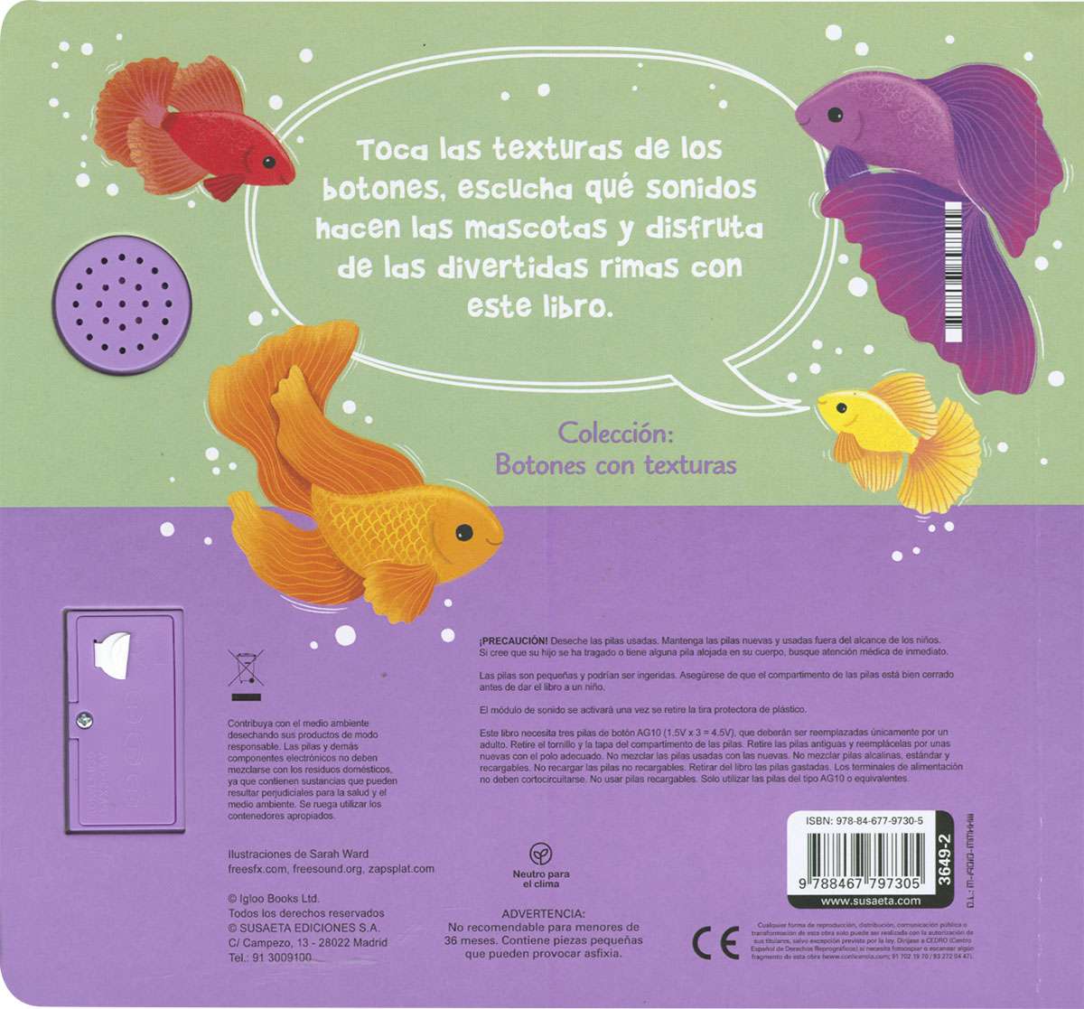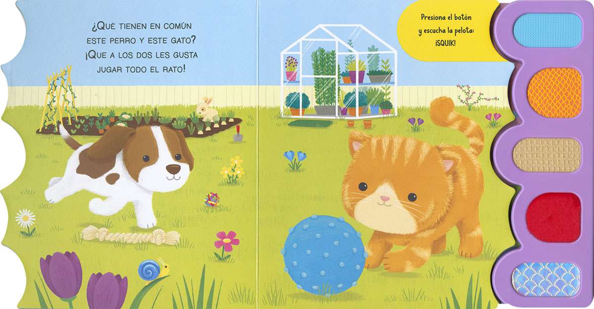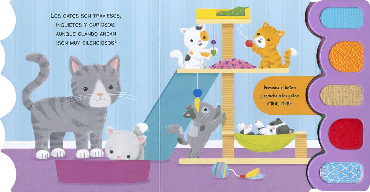 ¡Botones de sonido con texturas! Para que sientas a las mascotas muy cerca de ti. Toca, escucha y lee las sencillas rimas de este libro de cartón interactivo. ¡Te encantará!