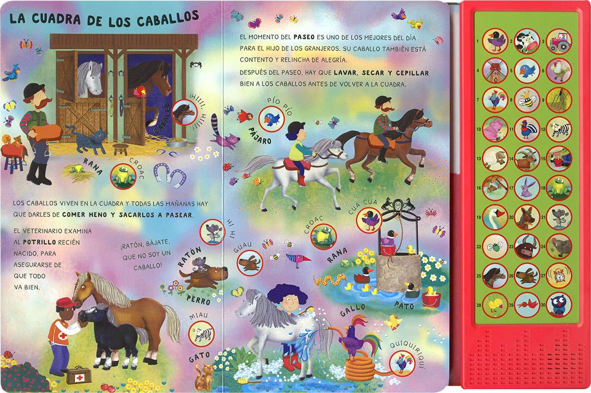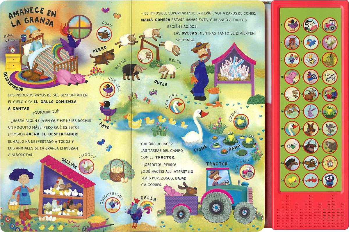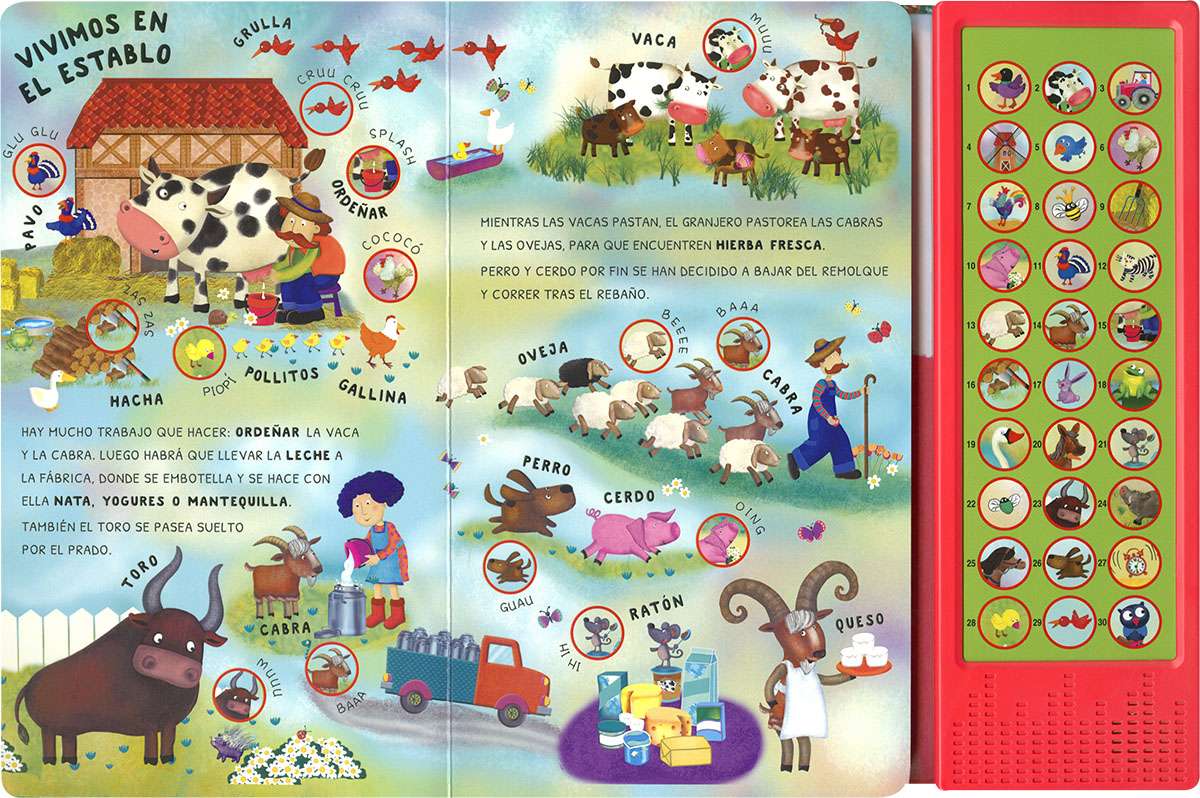 ¡Bienvenido a la granja más ruidosa y divertida! Pulsa los botones sonoros para darle vida y descubrir las actividades de la granja y los sonidos de sus animales.