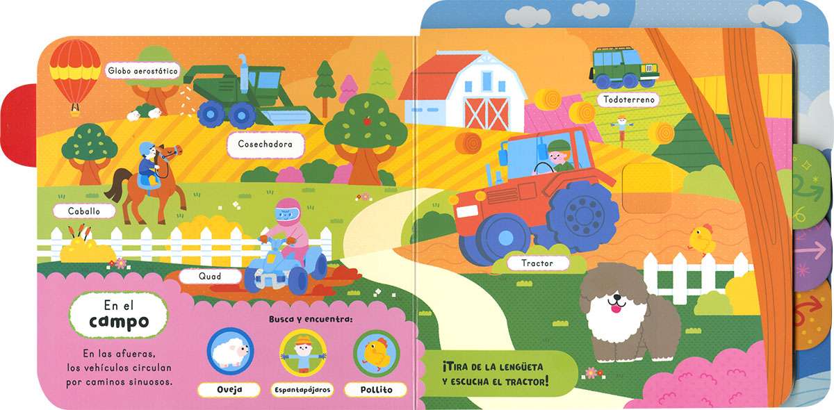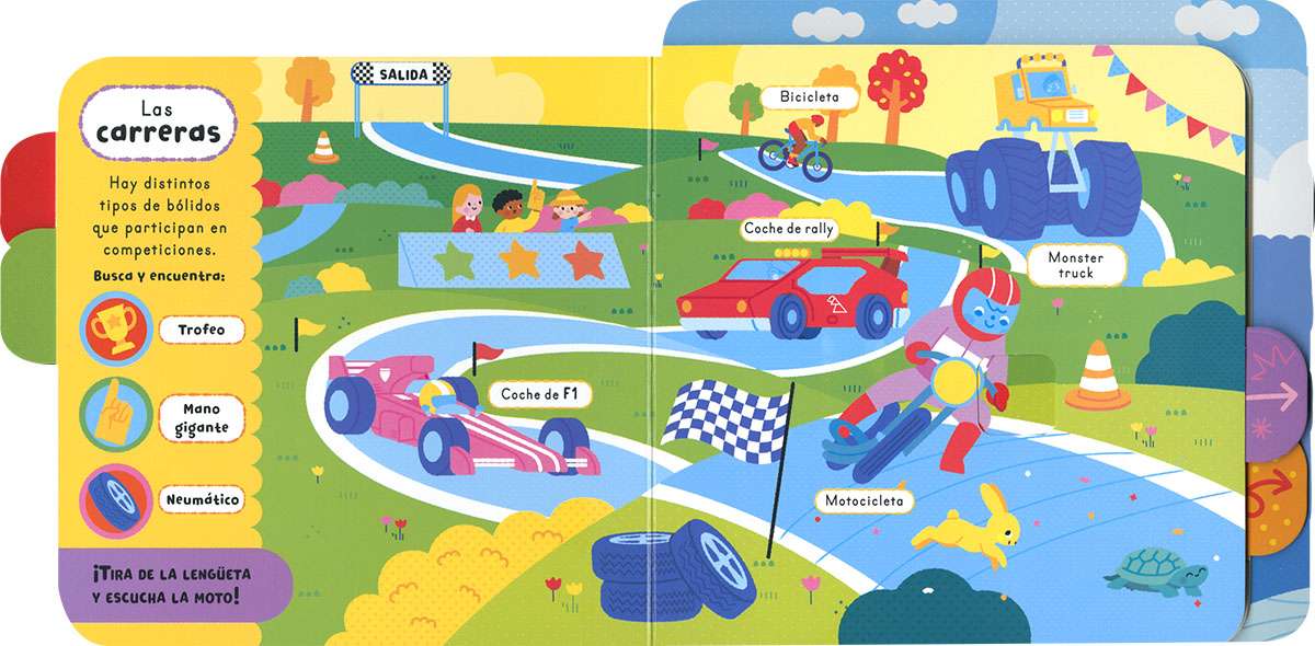 Los vehículos cobran vida con este libro de sonidos que se activan al tirar de la lengüeta. De coloridas y vibrantes ilustraciones, y asociando las palabras a los dibujos, este libro de cartón es perfecto para los más pequeños de la casa.
