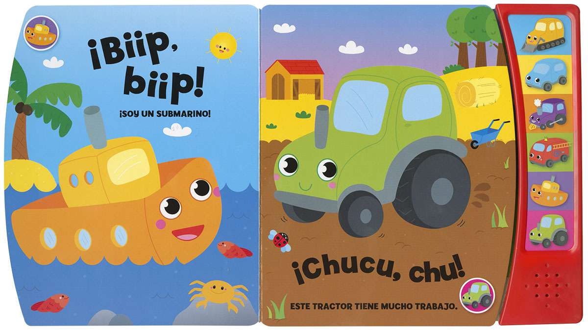 Seis botones diferentes para conocer los sonidos de los vehículos. Presiónalos cuando quieras saber qué sonido hacen una excavadora, un coche, una locomotora, un camión de bomberos, un barco o un tractor. ¡No podrás dejar de apretar los botones!
