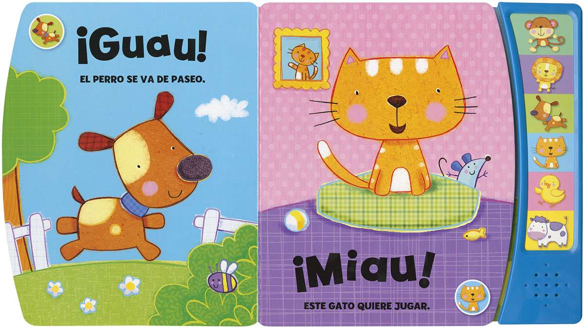 Seis botones diferentes para conocer los sonidos de los animales. Presiónalos cuando quieras saber qué sonido hacen un mono, un león, un perrito, un gatito, un pato o una vaca. ¡No podrás dejar de apretar los botones!