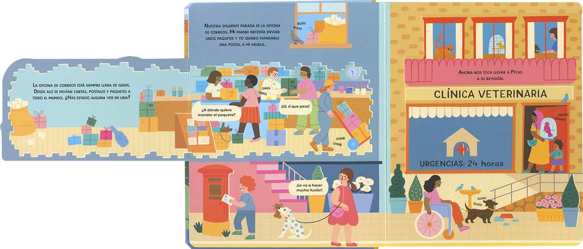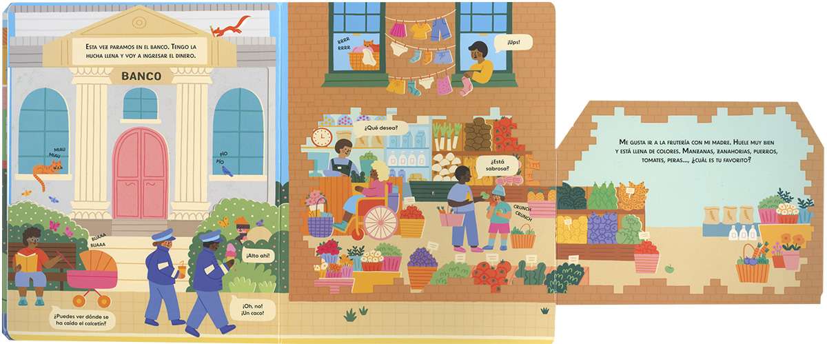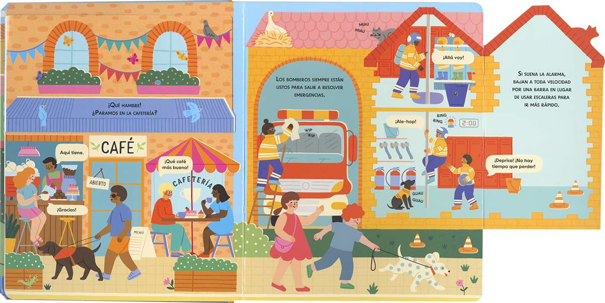 ¡Disfruta de un fantástico día en la ciudad! Visita la biblioteca, la clínica veterinaria, la panadería y muchos sitios más mientras descubres los sonidos que se escuchan al desplegar las páginas.