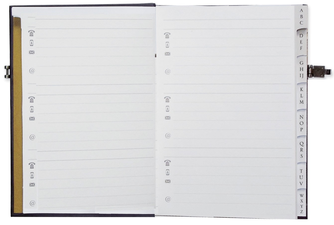 Binding: Cartoné con relieve sobre laminado plata, cierre con broche magnético en plata y bolsillo interno