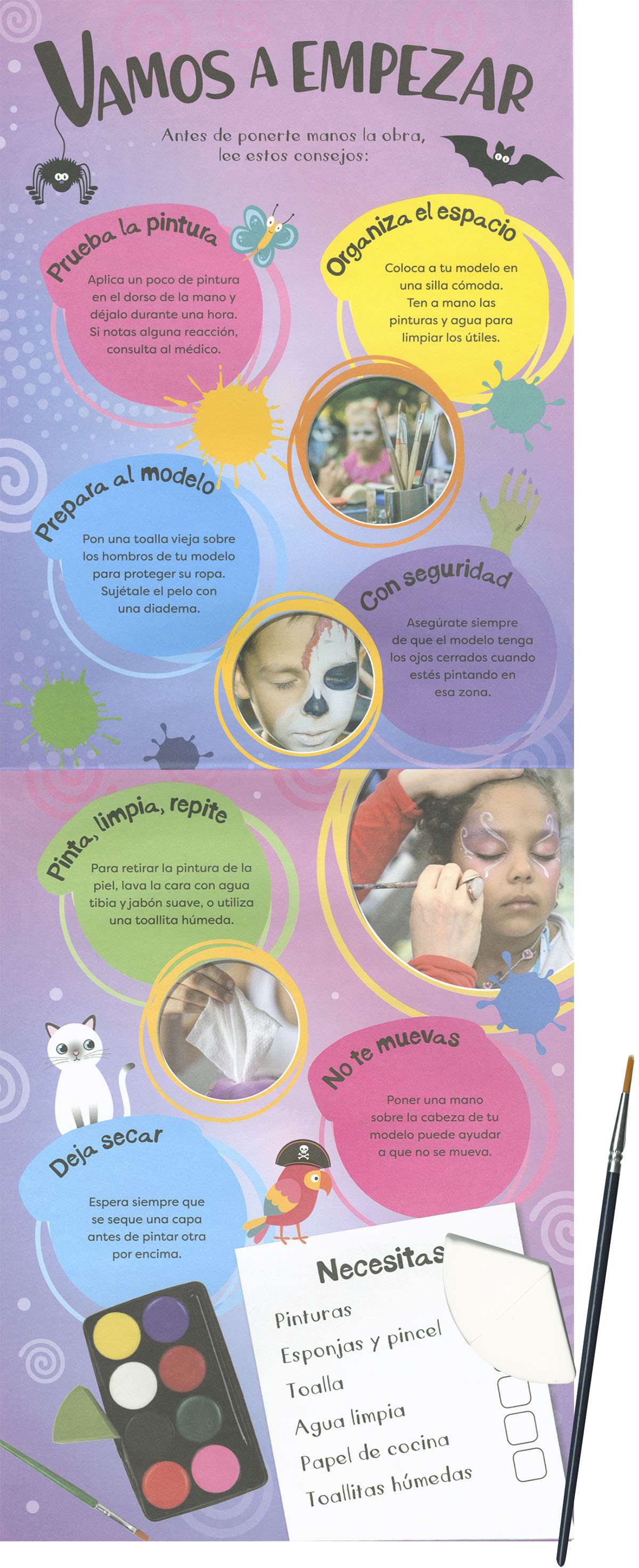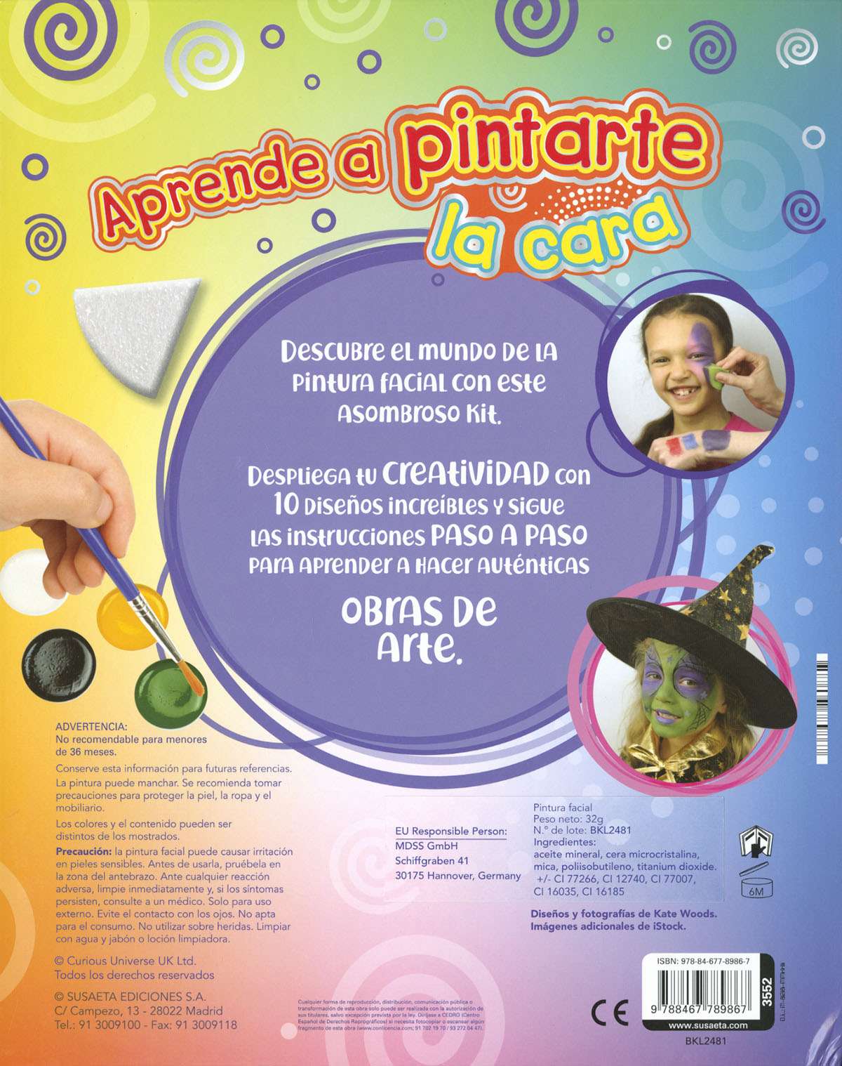 Binding: Caja de cartón, contiene: 1 libro, 1 pincel, 8 botes de pintura de cara y 2 esponjas