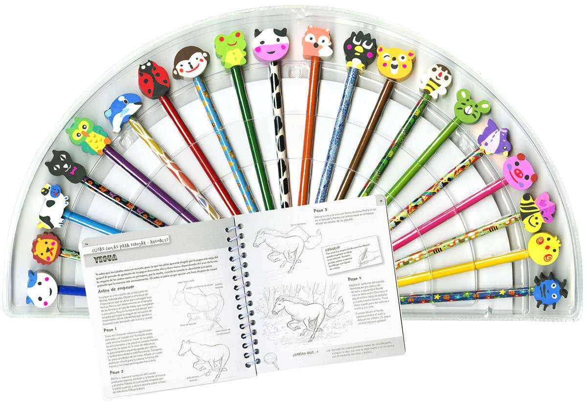Aprende a dibujar un montón de animales con las sencillas instrucciones de este libro. Después, tendrás que colorearlos... ¡y no te faltará material! Porque con este libro se incluyen nada menos que 20 lápices de colores con 20 gomas en forma de animales que te van a encantar. Y, para completarlo, ¡un sacapuntas!