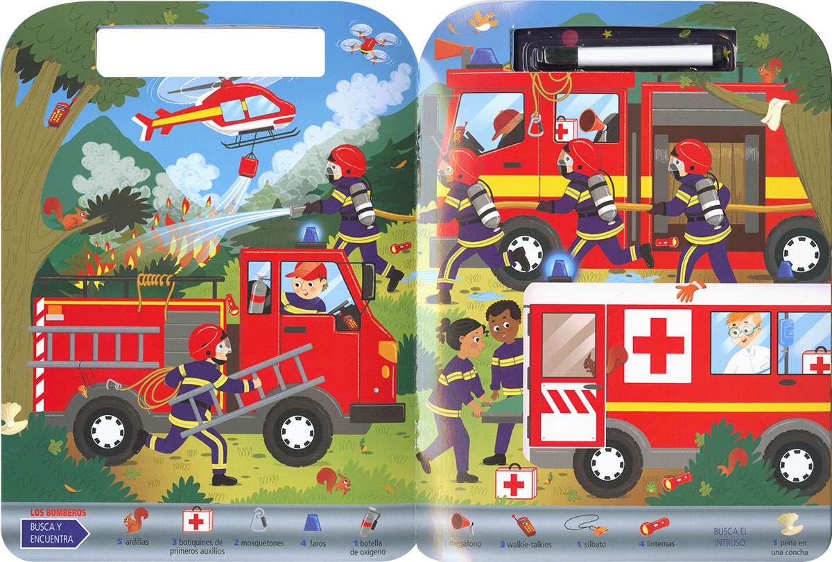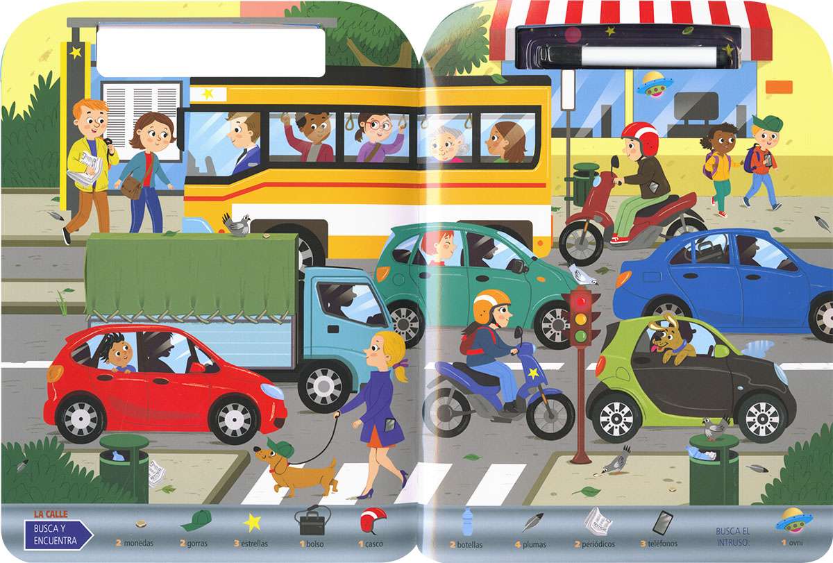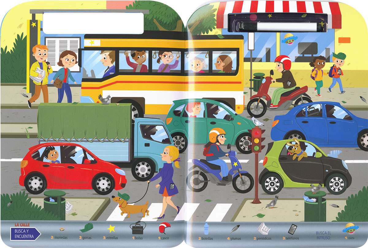 Descubre el mundo de los vehículos y las máquinas, y diviértete buscando todo lo que se esconde en cada página y marcándolo con el rotulador; luego, borra y ¡comienza de nuevo!