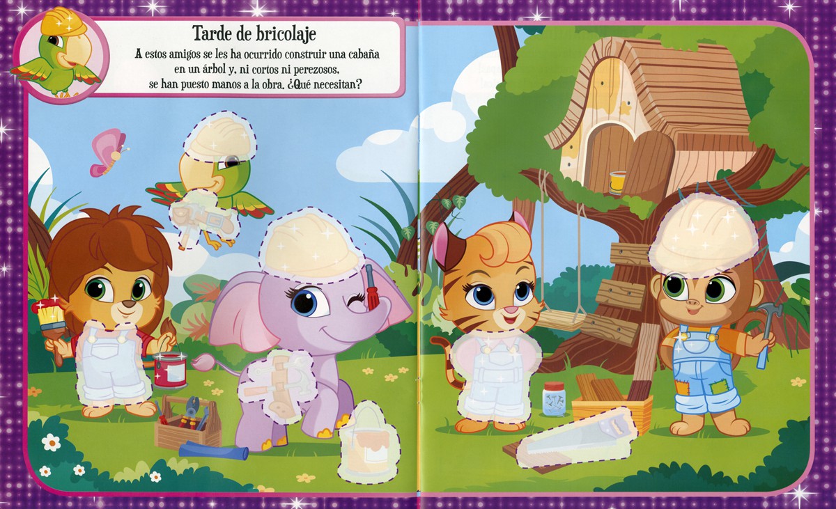Completa con más de 250 pegatinas las diferentes escenas de esta divertida selva: una fiesta tropical, un baño en el lago, un carnaval, un cumpleaños... ¡Y colorea la última página!