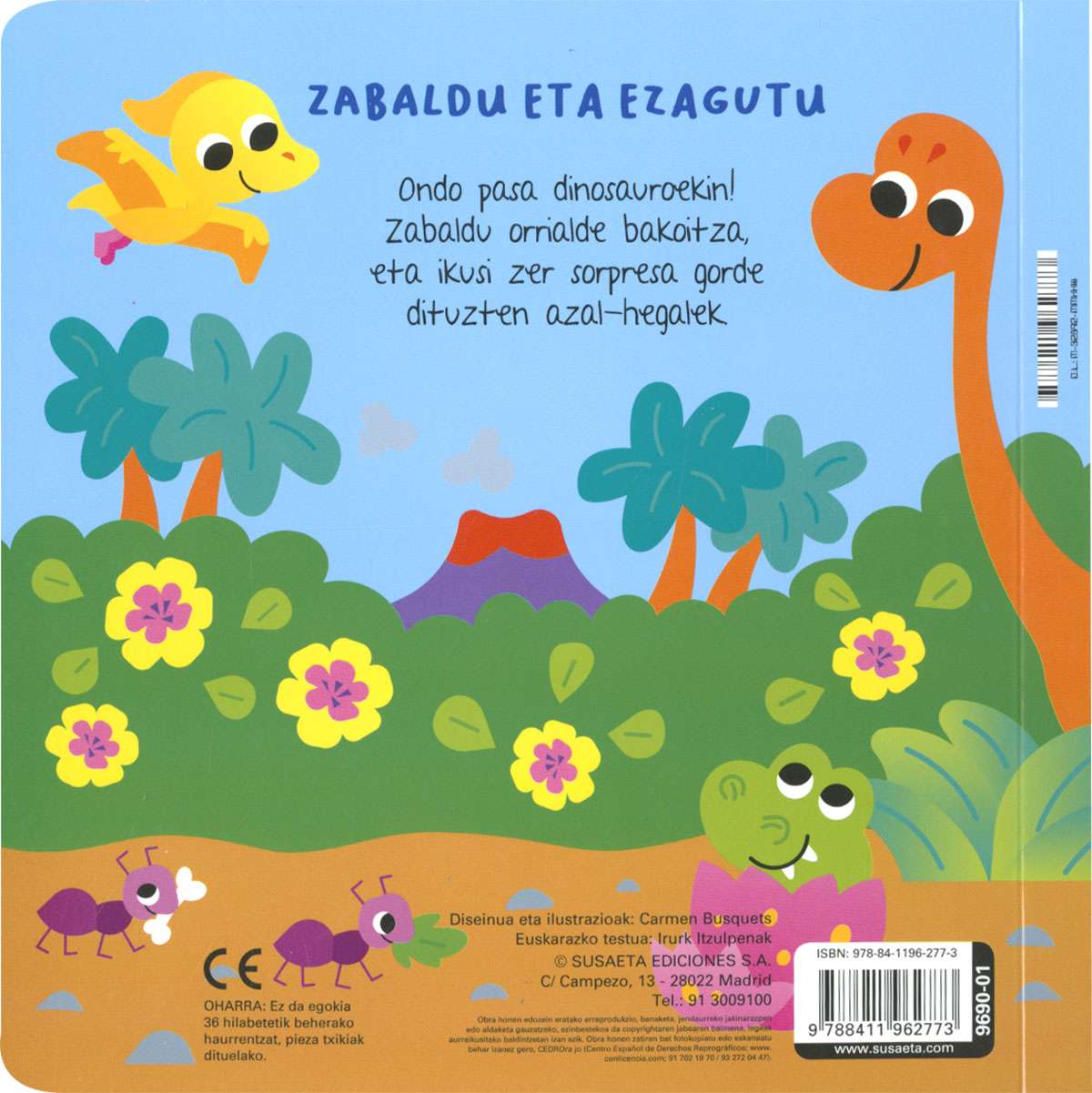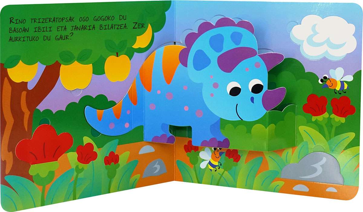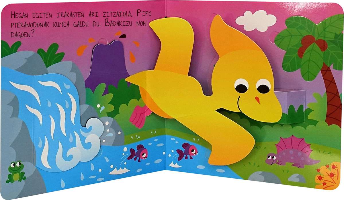 Ondo pasa dinosauroekin! Zabaldu orrialde bakoitza, eta ikusi zer sorpresa gorde dituzten azal-hegalek.