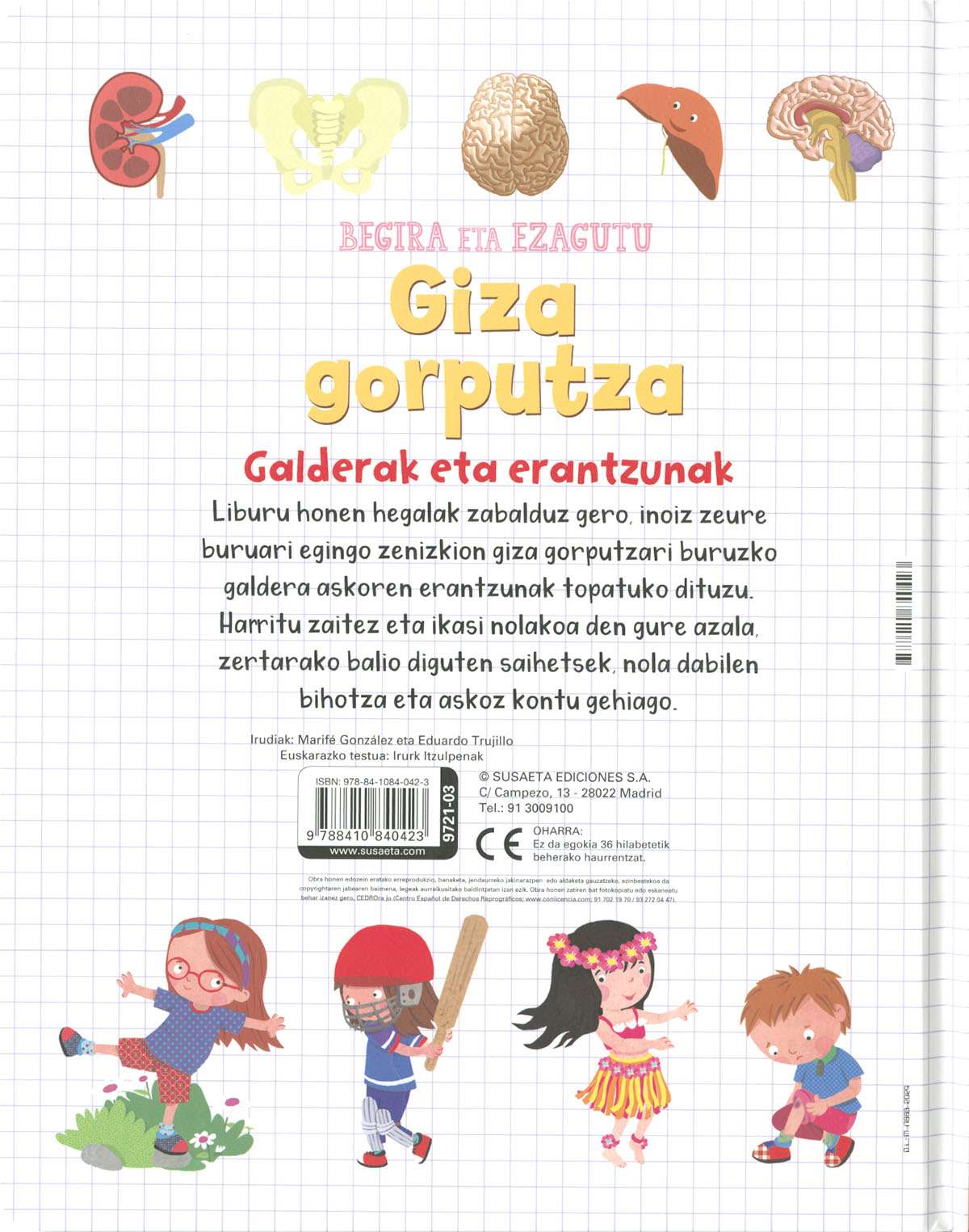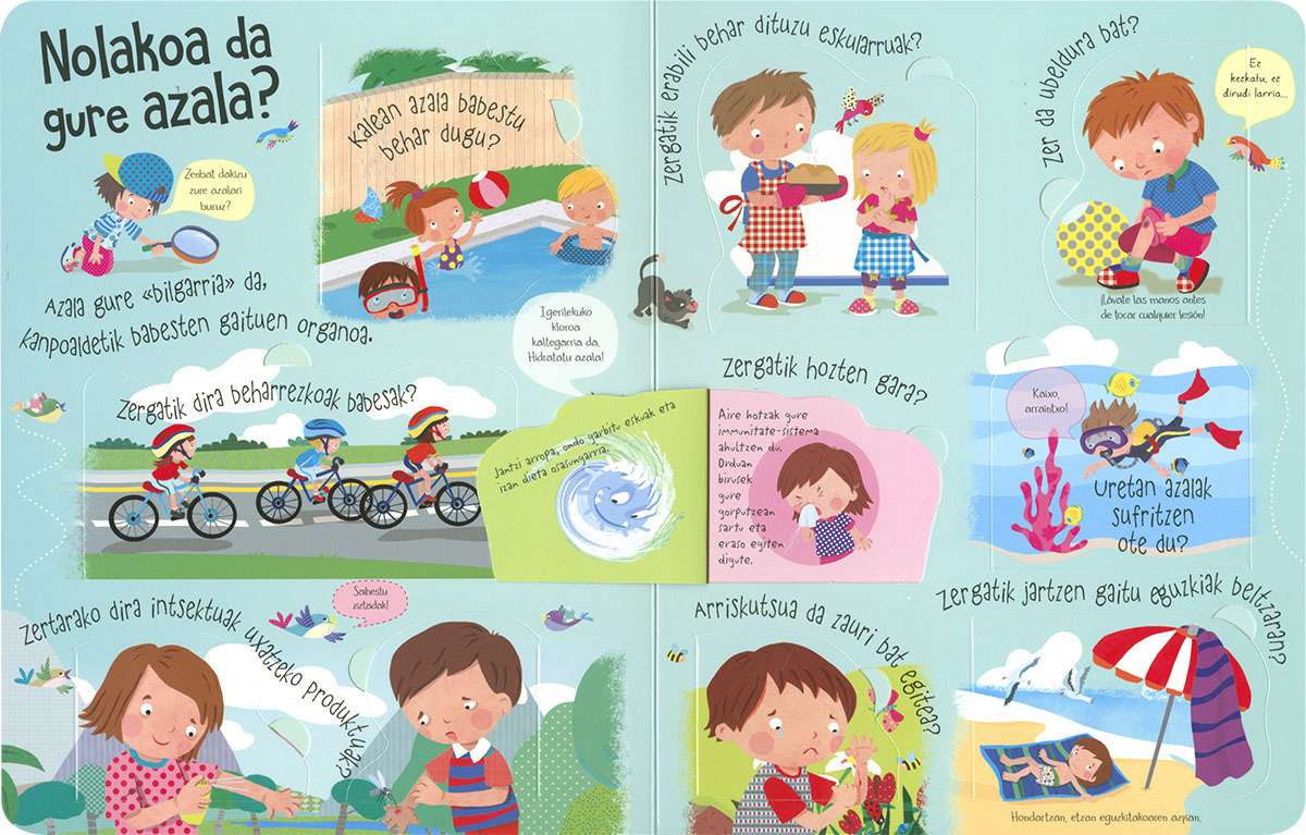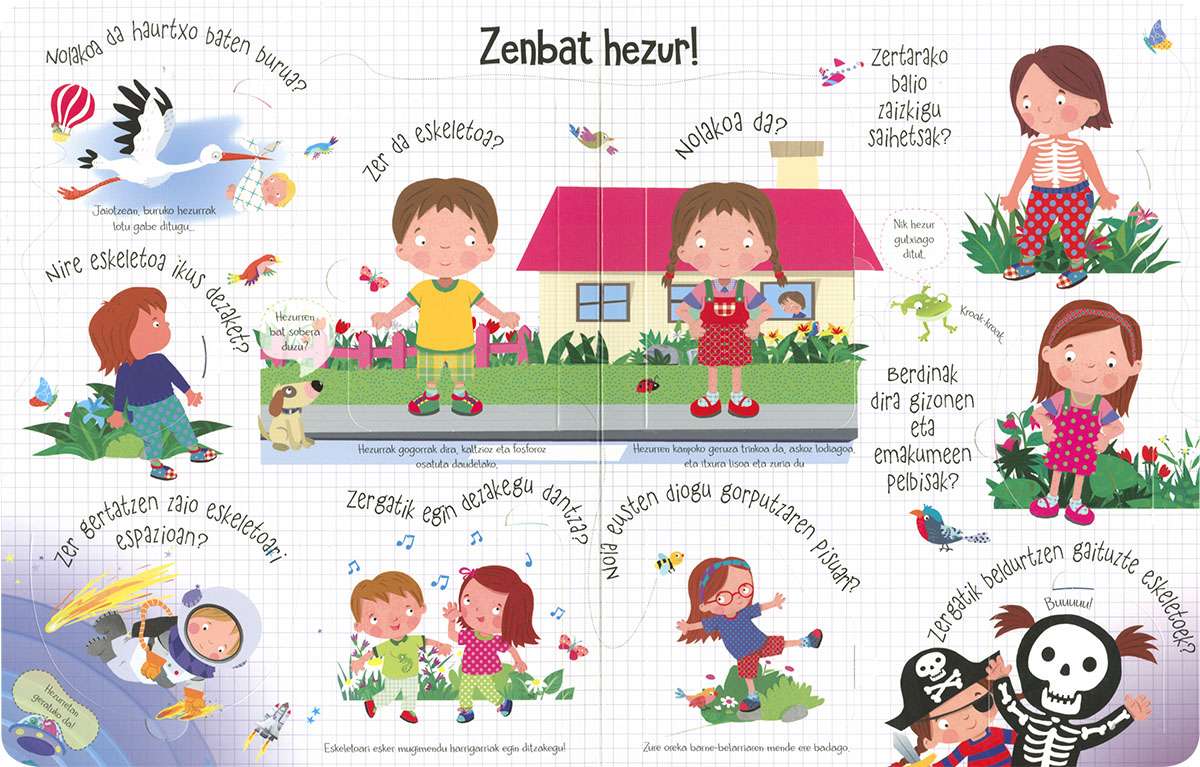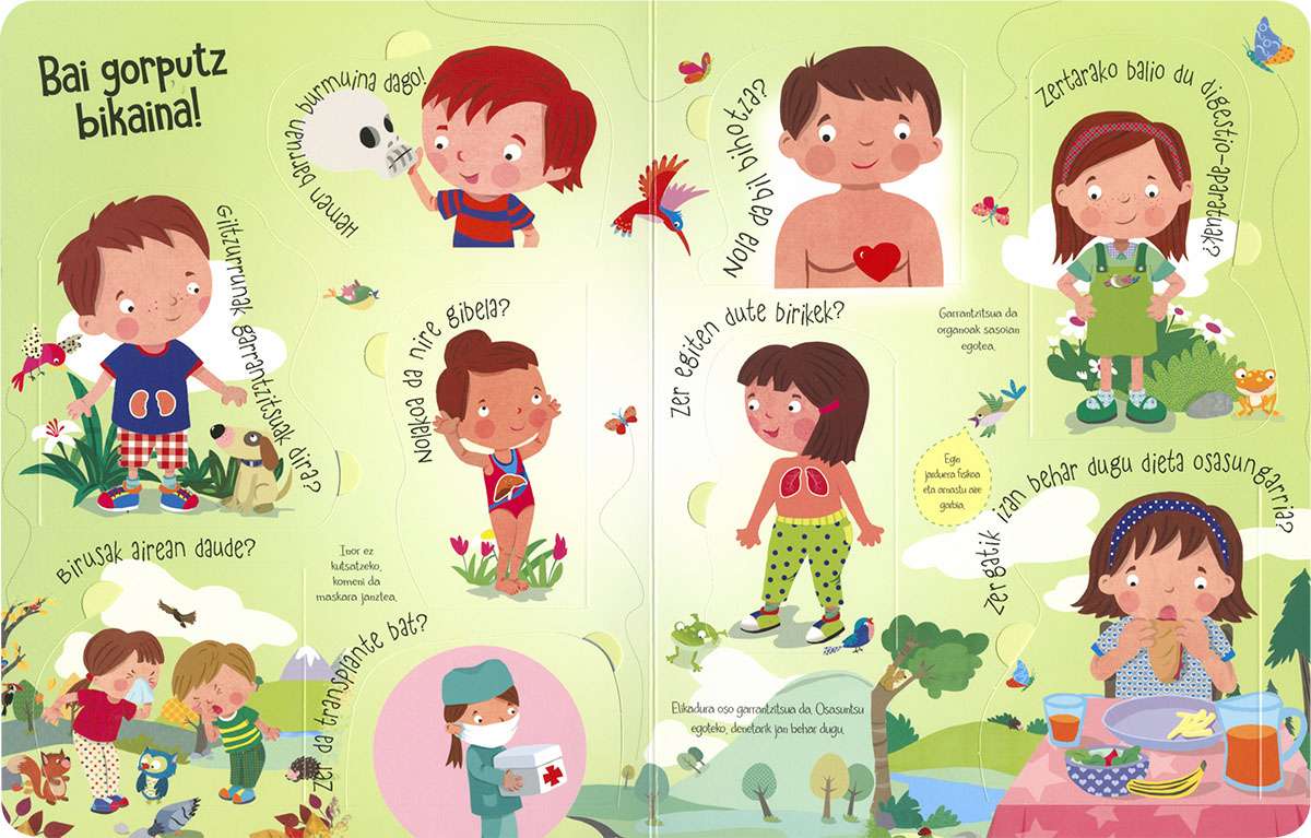 Liburu honen hegalak zabalduz gero, inoiz zeure buruari egingo zenizkion giza gorputzari buruzko galdera askoren erantzunak topatuko dituzu. Harritu zaitez eta ikasi nolakoa den gure azala, zertarako balio diguten saihetsek, nola dabilen bihotza eta askoz kontu gehiago.