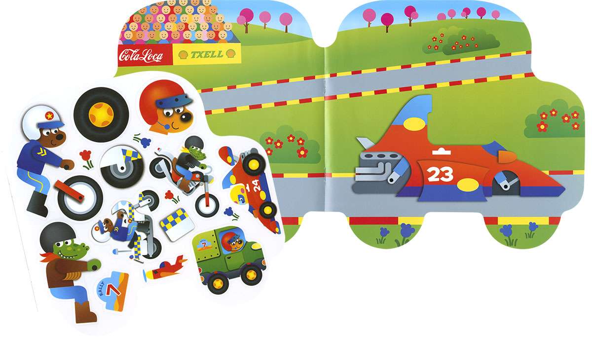 Osatu irudiak eta ibilgailuak liburuko eranskailuekin. Lekuz alda ditzakezu, eta nahi beste aldiz itsatsi eta kendu. Zein dibertigarria!