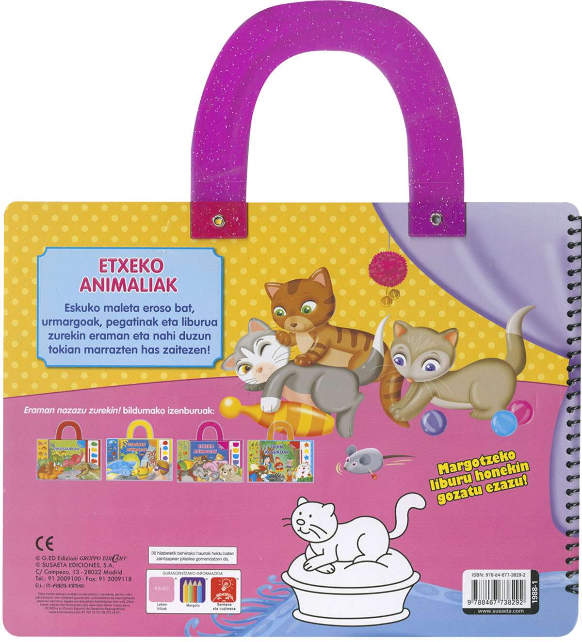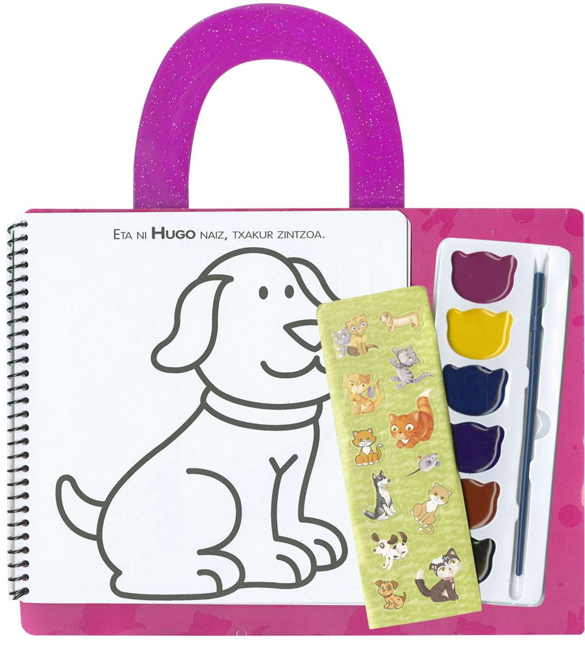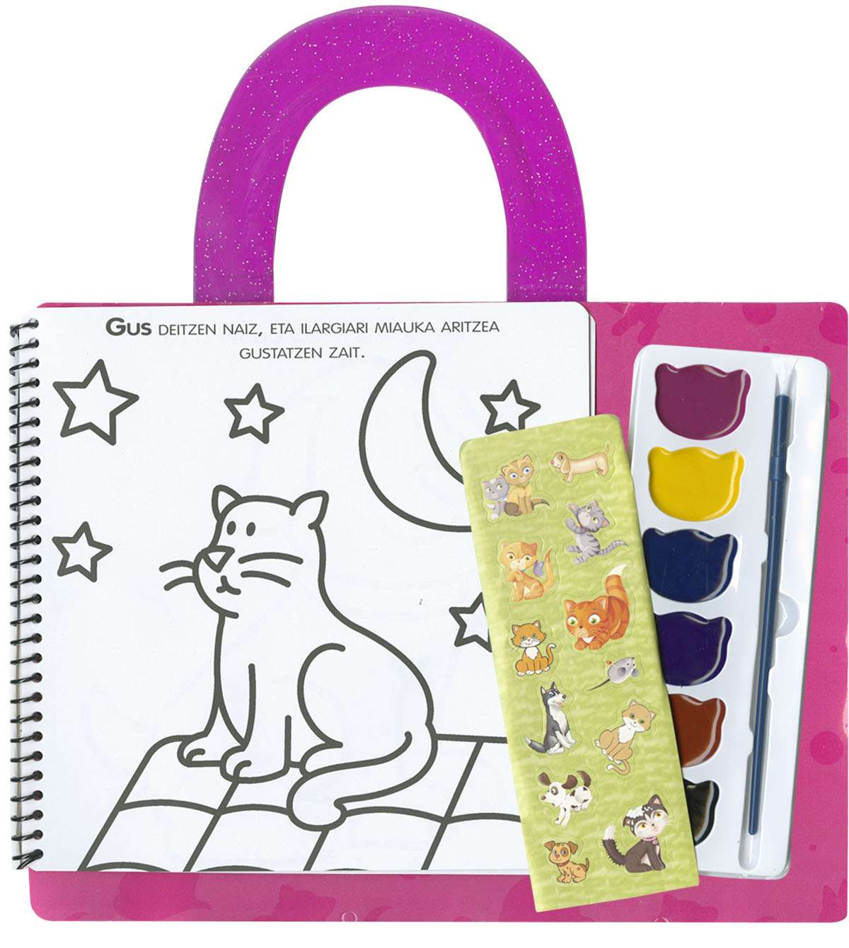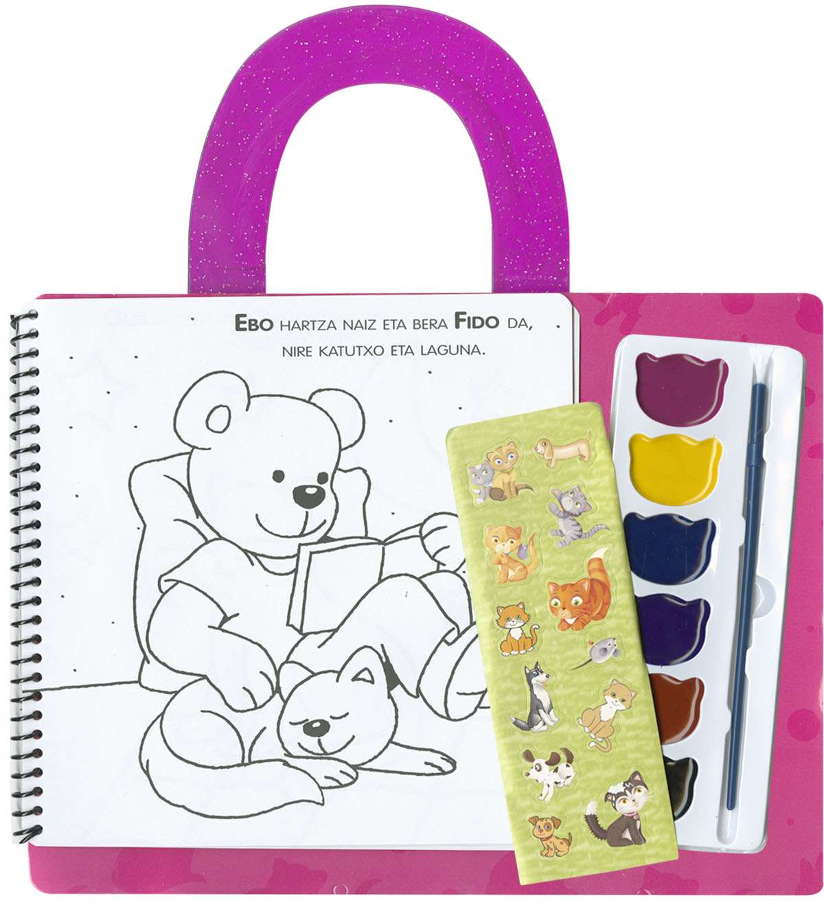 Binding: Plastifikatua kartulina eta aldiko espiral eta plastikozko heldulekua,akuarela,eskuila eta pegatinak