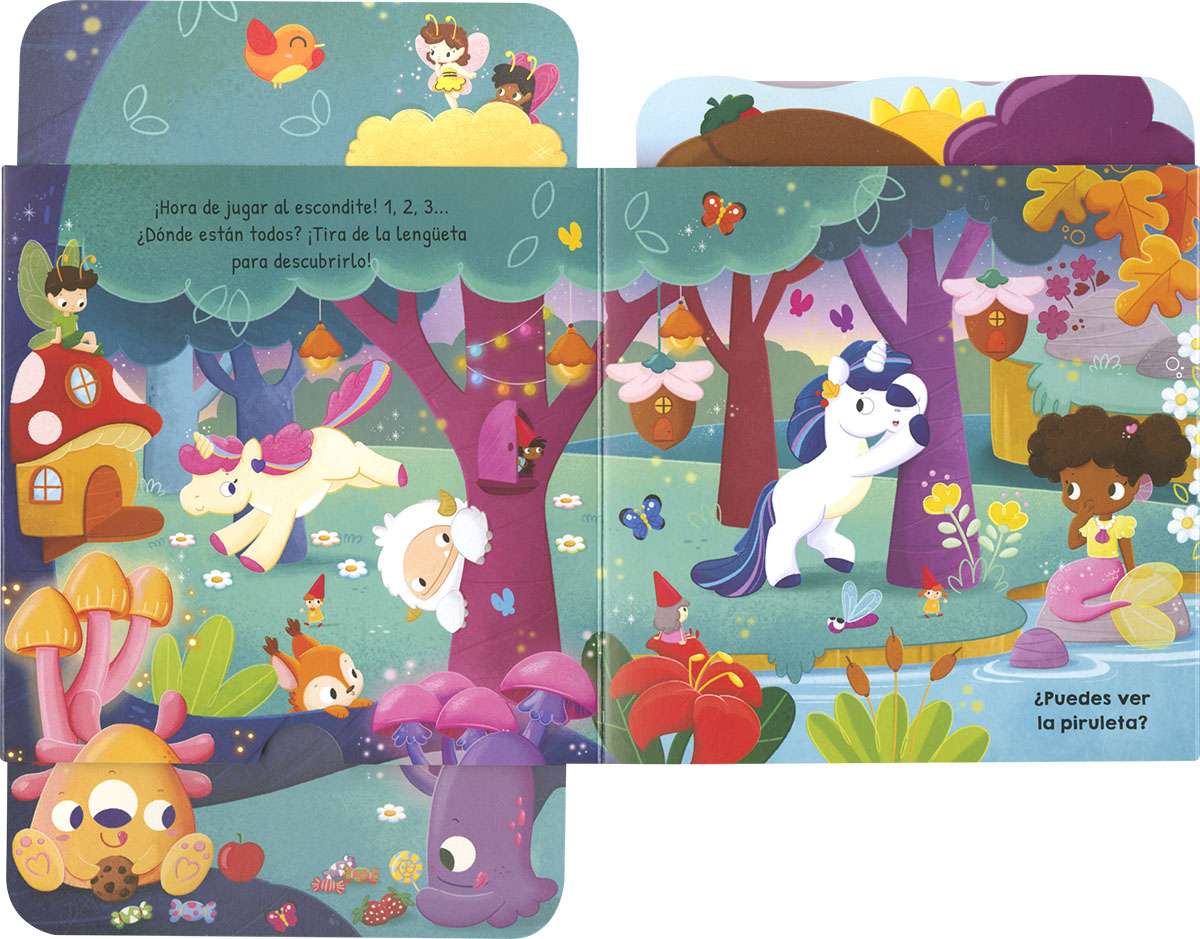 En el mundo mágico hay muchas criaturas fantásticas y algunas están escondidas, pero, si tiras de la lengüeta, es posible que las encuentres... ¿Las ves? Busca en este sorprendente libro infantil de original mecanismo perfecto para los niños y niñas más curiosos y divertidos.