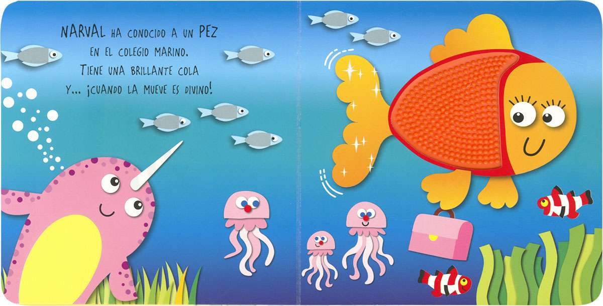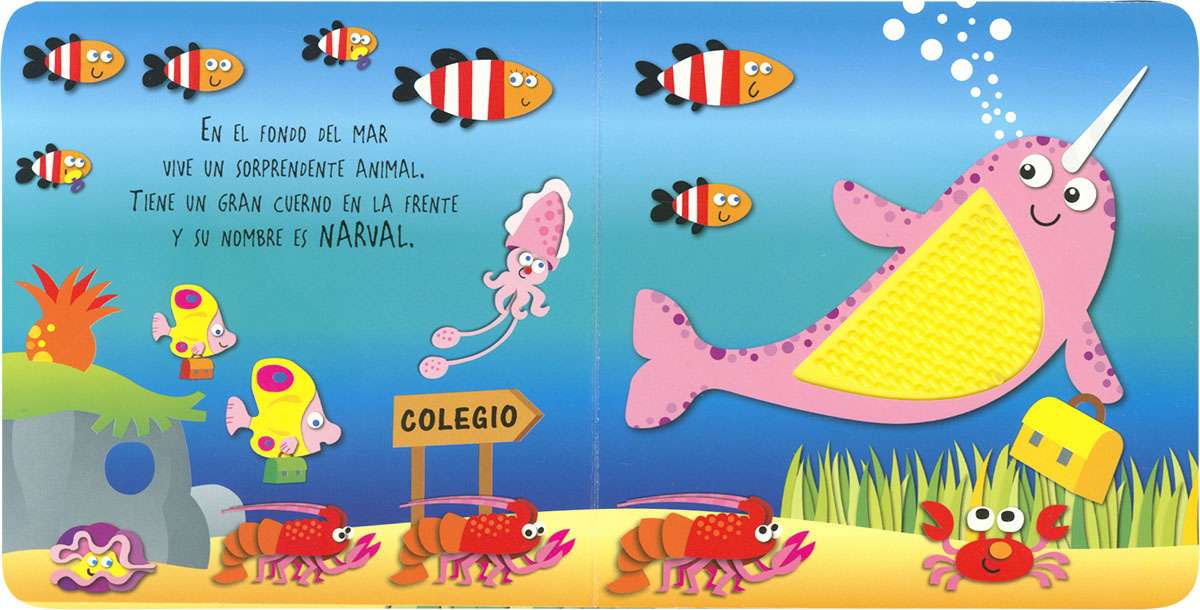 Acércate a tus animales del mar favoritos y tócalos. ¿Qué sientes? ¿Es igual el pulpo que el narval? Un libro con simpáticas rimas y llamativas texturas para percibir, divertirse y experimentar.