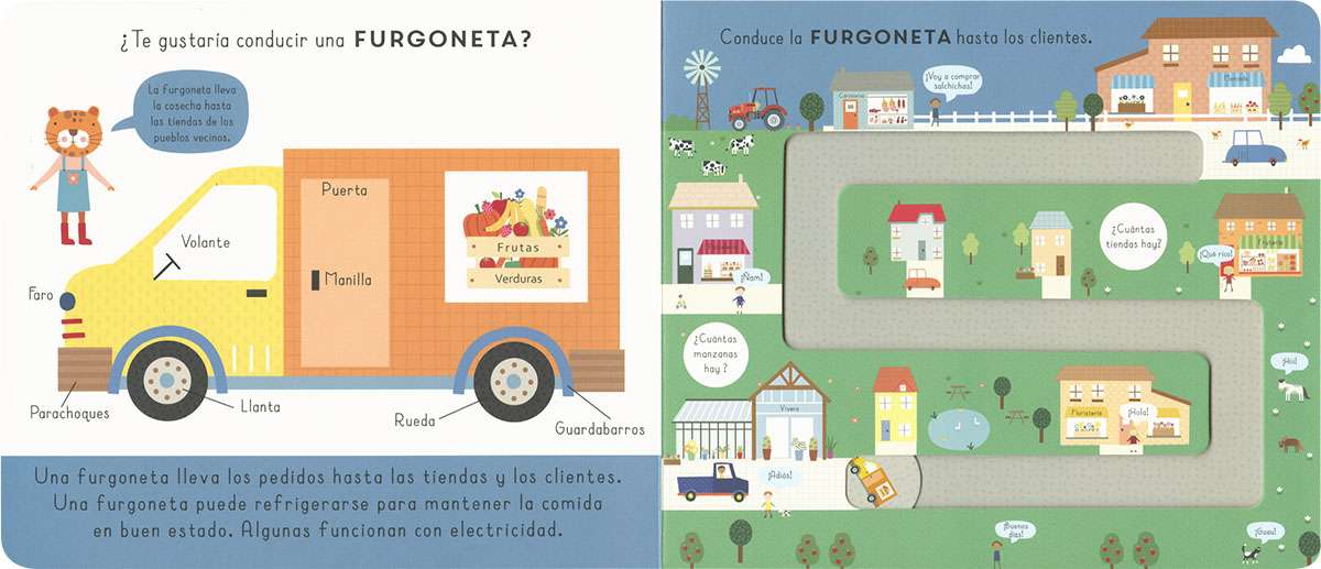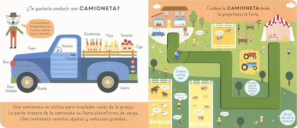 ¿Te gustaría conducir un tractor? ¿Y una cosechadora? Con este libro de cartón podrás hacerlo: mueve el disco por el camino trazado con tu dedito mientras aprendes cosas sobre cada vehículo. ¡Hay cinco diferentes para conducir!