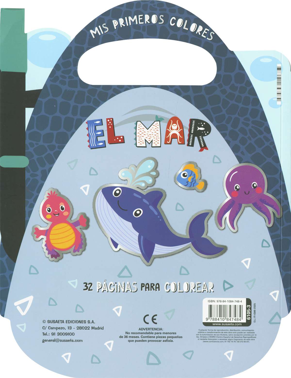 32 páginas marinas para colorear en un formato con asa para llevar el libro adonde quieras y cuando quieras. ¡Y con fantásticas pegatinas para completar tus dibujos!