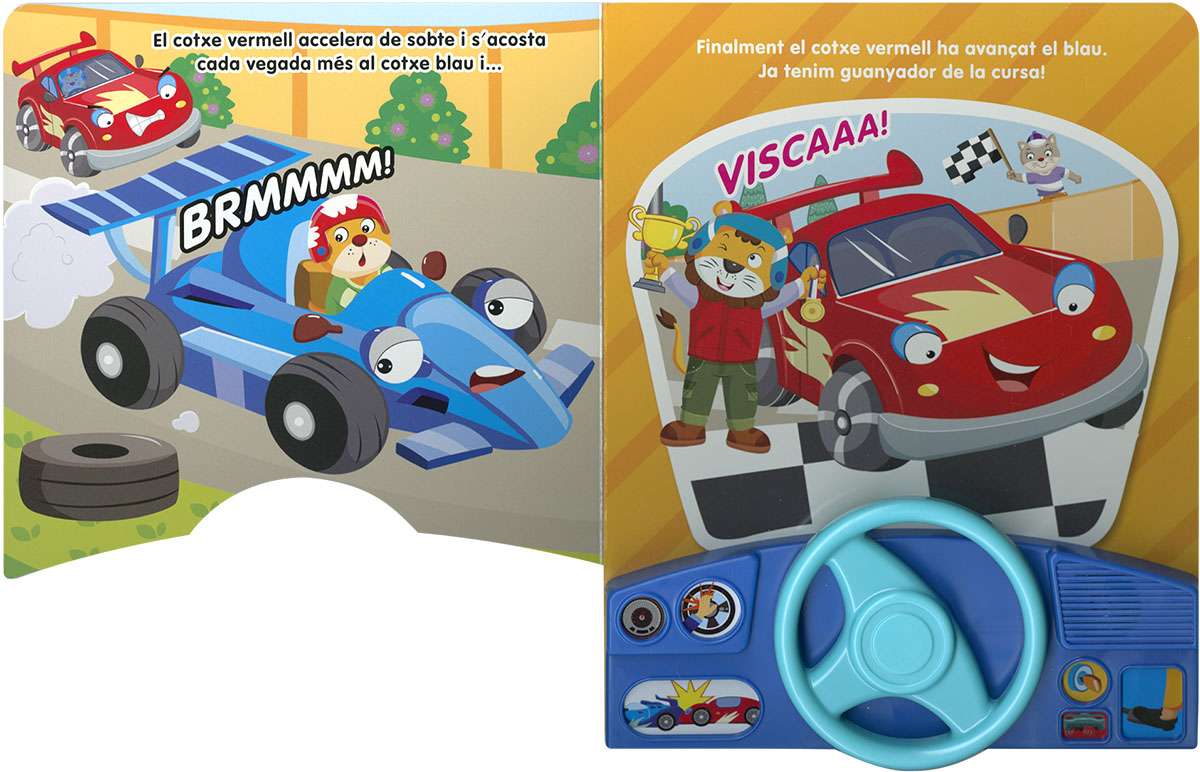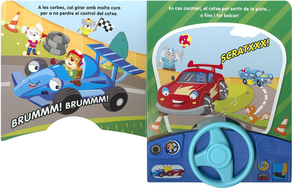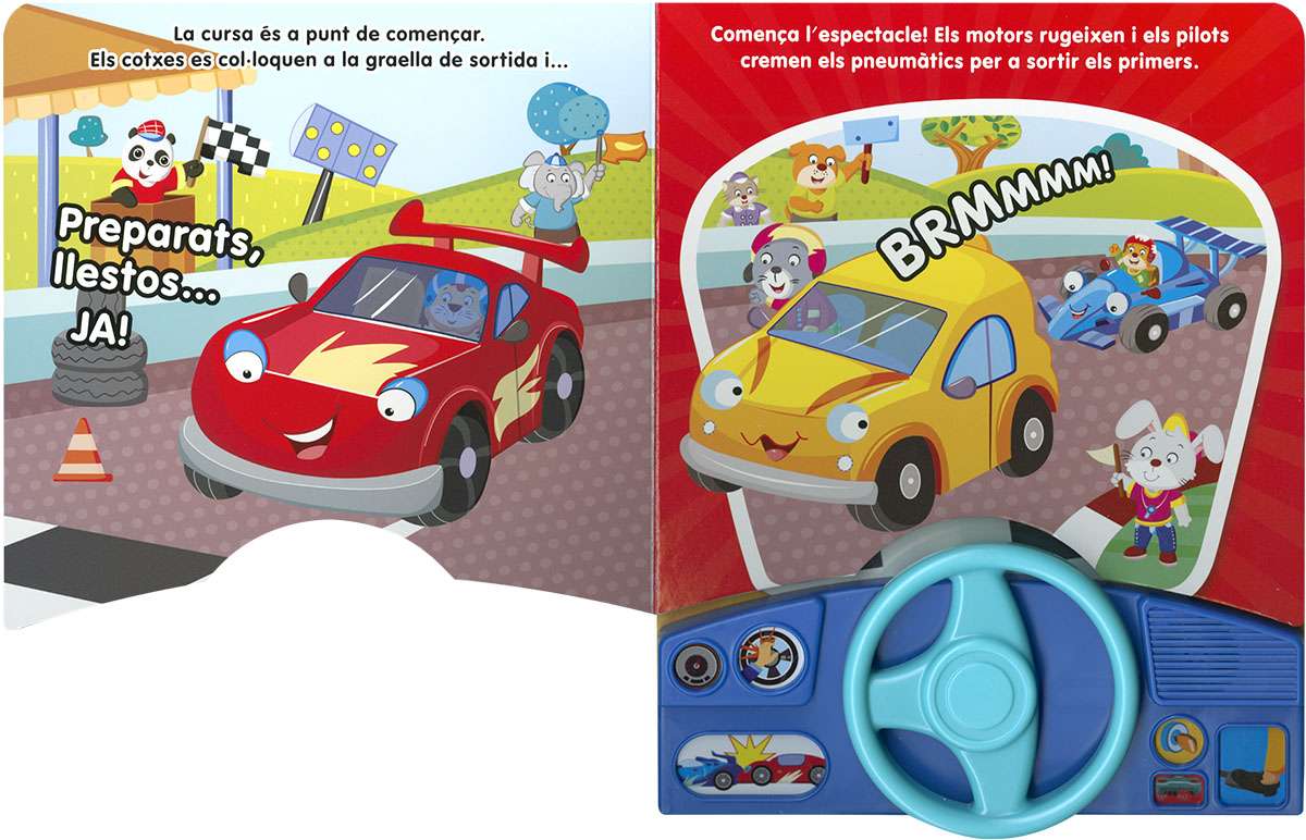 La cursa està a punt de començar... Preparats, llestos... ja! ¡Gira el volant! ¡Frena! Toca el clàxon! Compte, que et donen! Segur que arribes el primer, però si no... Ja saps que l'important és divertir-se, i amb aquest llibre de sons i amb volant la diversió està assegurada.