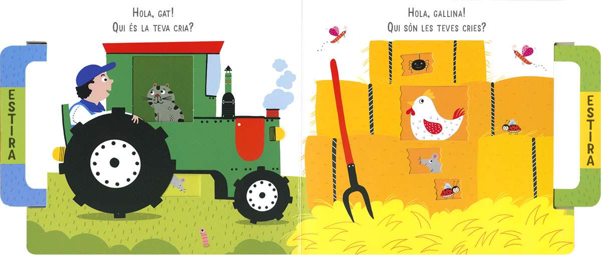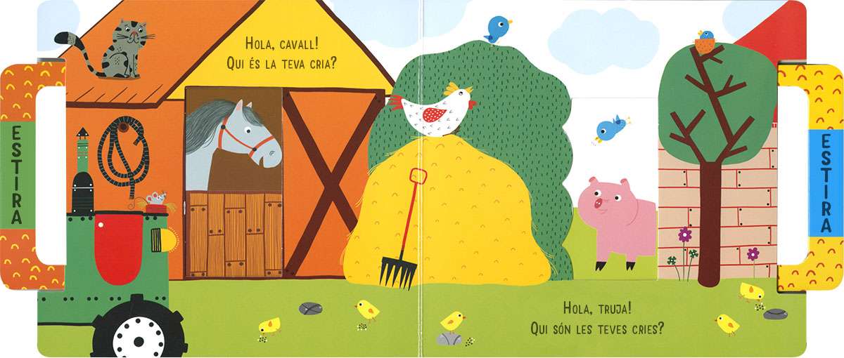 En aquesta masia hi ha moltes cries d'animals. Les hauràs de trobar! Estira la nansa per a saber on són. T'encantarà estirar-la una vegada i una altra, perquè hi ha sons amb el moviment! És un llibre de cartró ideal per als més petits de la casa!