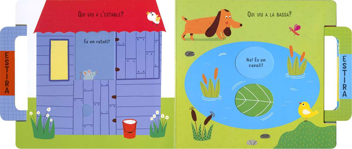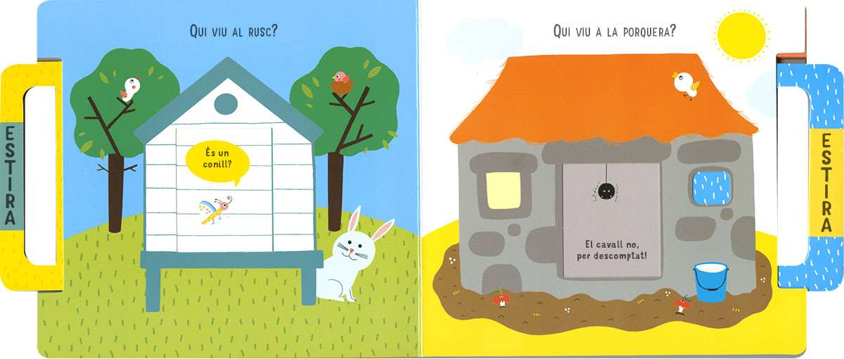 Qui viu a l'estable? I a la porquera? Vols esbrinar-ho? Estira la nansa per a saber on tenen la seva casa els animals. T'encantarà estirar-la una vegada i una altra, perquè hi ha sons amb el moviment! És un llibre de cartró ideal per als més petits de la casa!