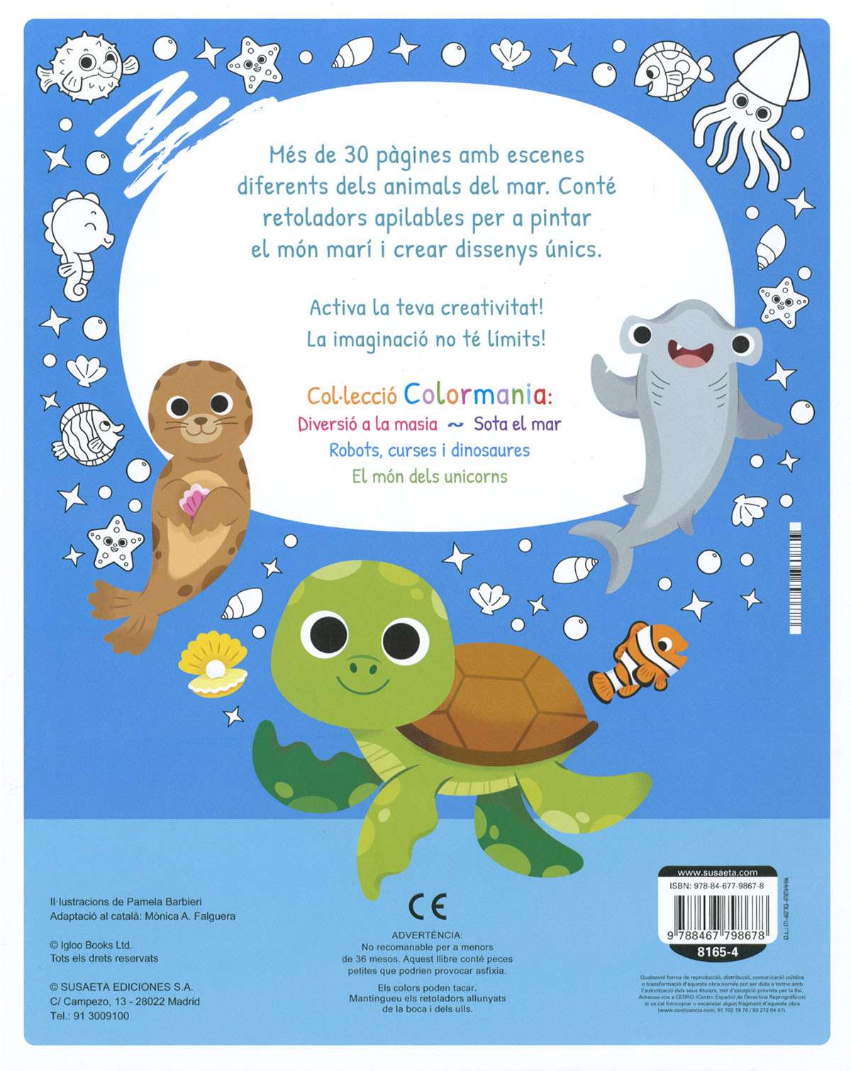 Juga i crea amb aquest llibre, que té 30 pàgines amb escenes diferents del mar perquè les pintis amb les pintures que l'acompanyen. Aquest llibre no conté plàstics d'un sol ús. Ajuda'ns a tenir cura del medi ambient!