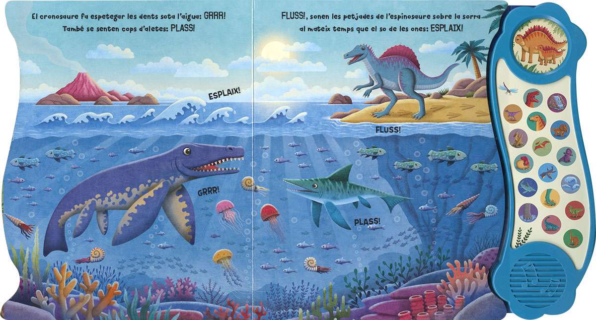 Descobreix l'apassionant món dels dinosaures! Puja fins al cim de les muntanyes o submergeix-te al mar per a sentir 18 fantàstics sons, des del rugit d'un tiranosaure fins al grall d'un pterodàctil. Aquest llibre de cartró de gran format és perfecte per als petits amants dels dinosaures.