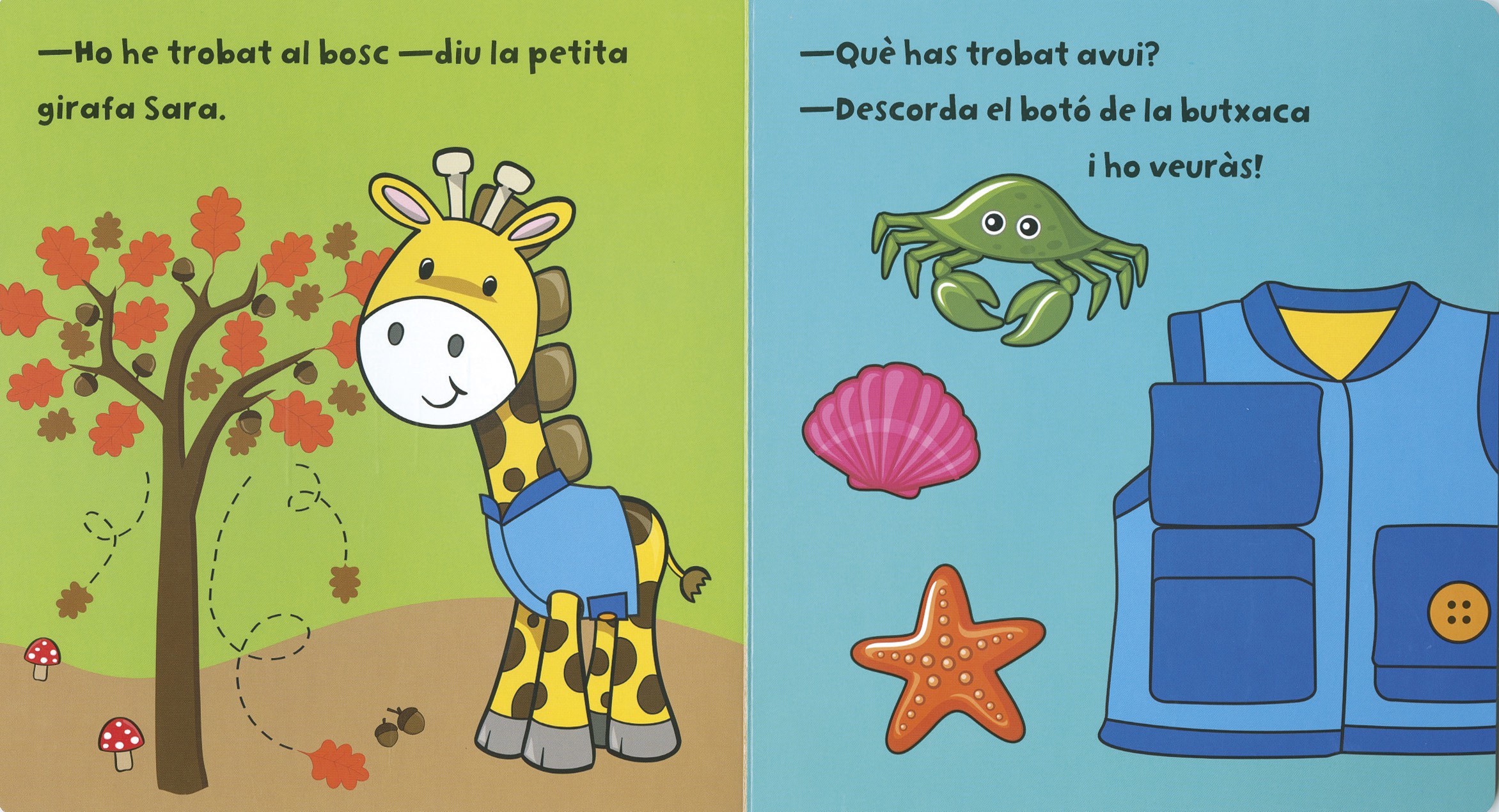 La jirafa Rafa ha encontrado un montón de cosas interesantes. ¡Desabrocha el botón de su bolsillo y descúbrelas!