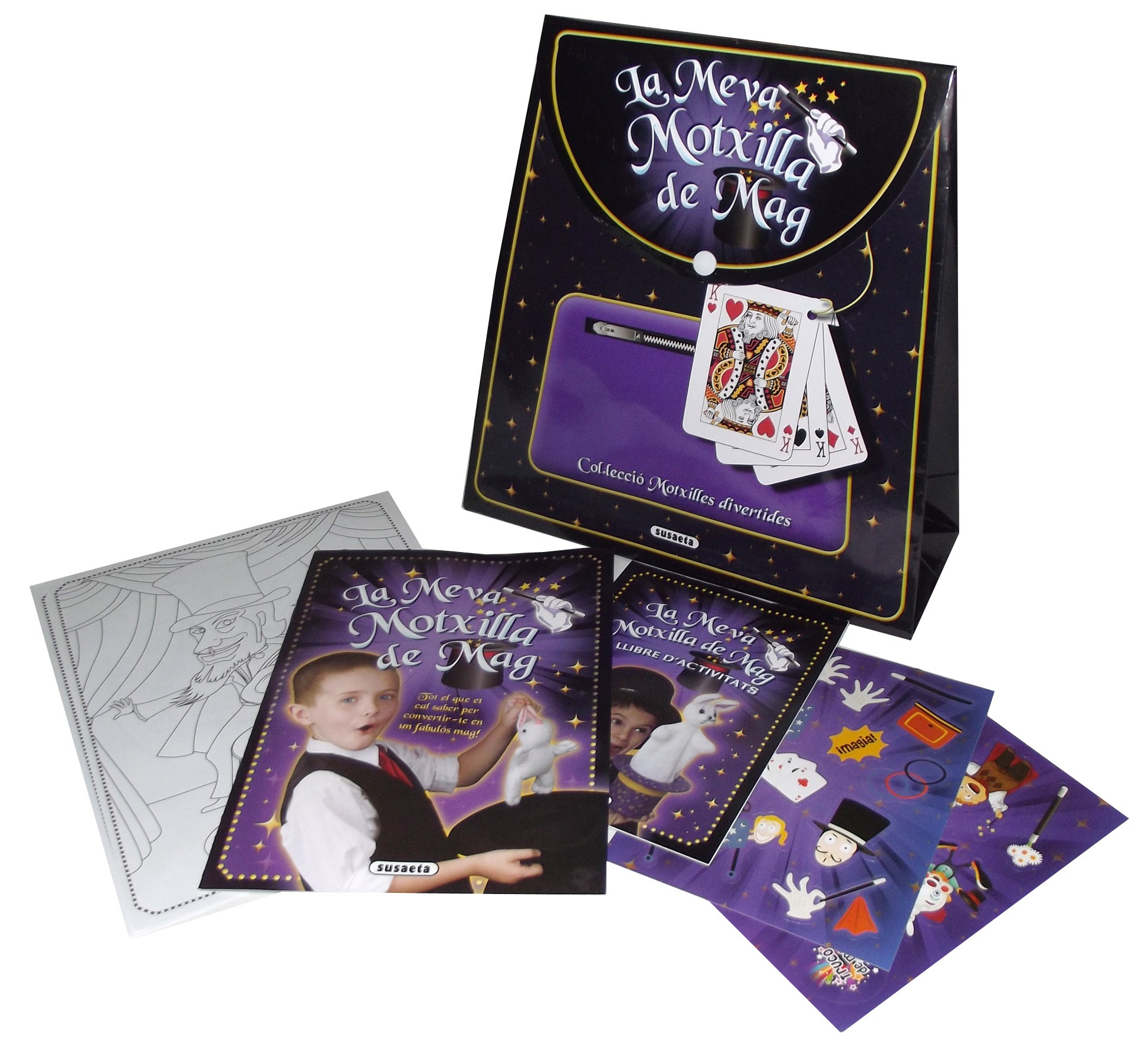 Binding: Motxilla de cartró plastificat, cinta elàstica, tancament de clic. Conté:2 llibres,4 làmines i adhes