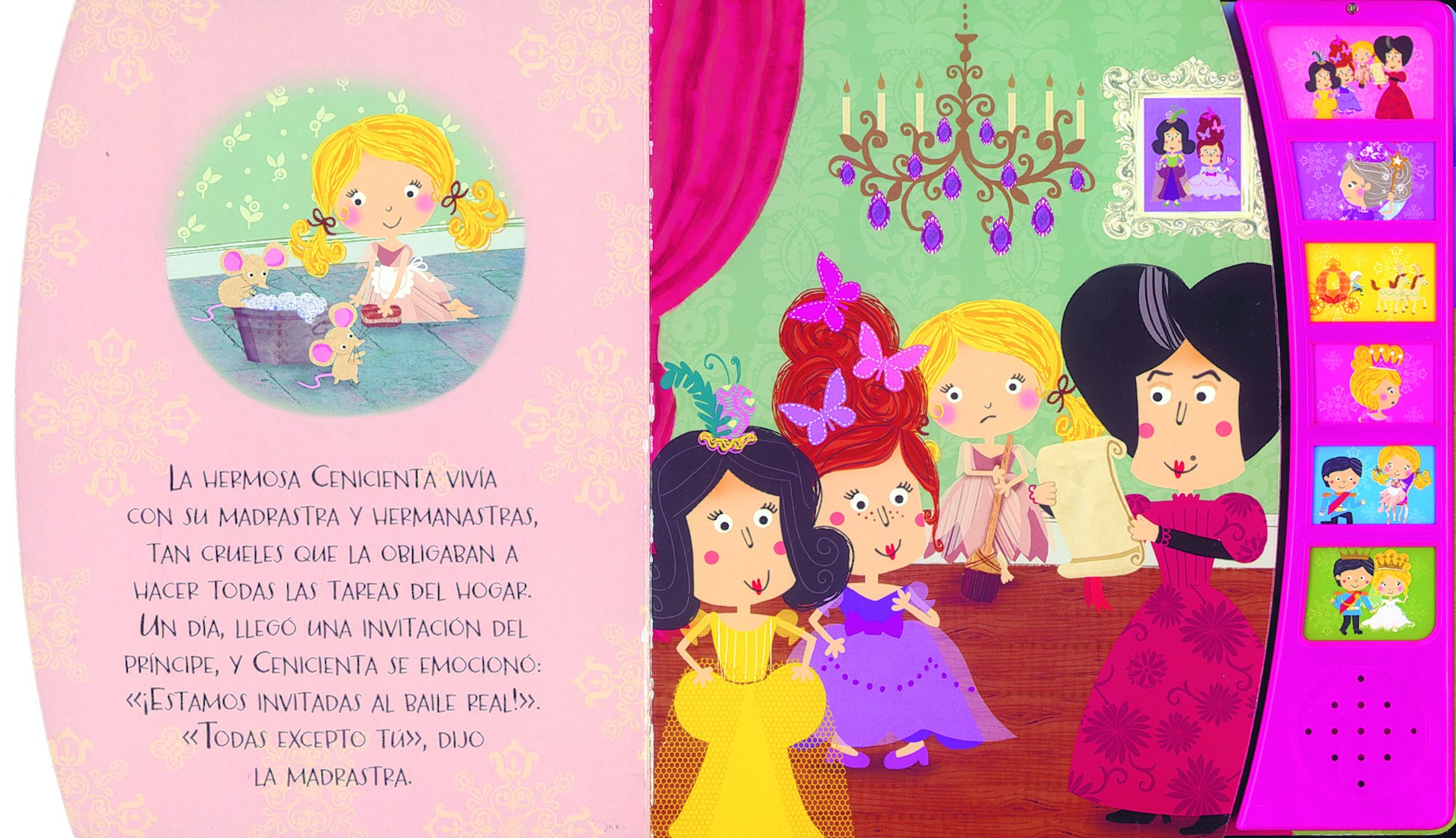 Binding: Cartón plastificado y troquelado con estampación y 6 pulsadores sonoros que cuentan el cuento