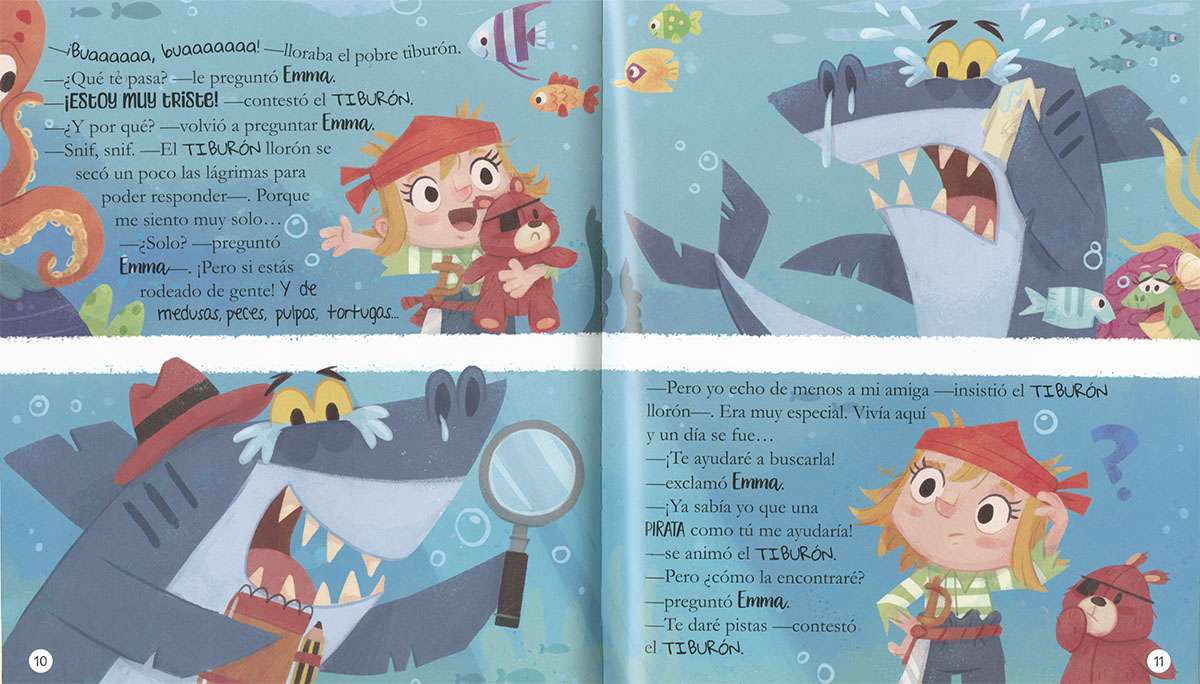 Aquel iba a ser un gran día para una pirata como Emma: ¡se iba de excursión al zoo! Preparó todas sus cosas y se llevó con ella a uno de sus pequepiratas. Lo primero que vieron fue el acuario marino y allí, entre otros muchos animales, se encontró con un tiburón que no paraba de llorar. Y Emma decidió ayudarle: tenía que buscar a una amiga a la que había perdido y el tiburón le fue dando pistas. ¿Lo conseguirá encontrar? Un gran libro ilustrado a todo color para los piratas más aventureros.